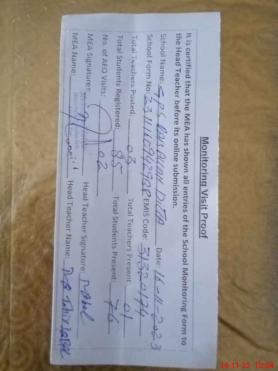 | Attendance Register | Head Teacher | MEA with School | Visit Proof |