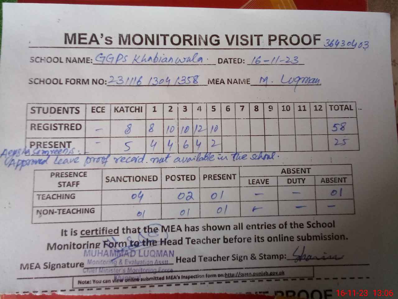 | EMIS Code: 36430403 | Name of School: GGPS KHABIAN WALA, TULAMBA | |||