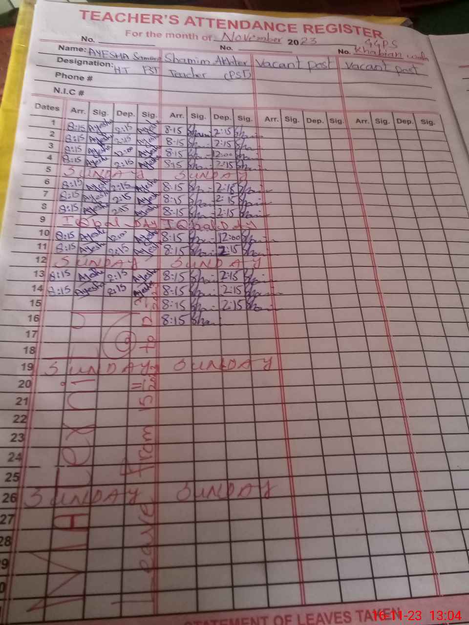 | Remarks (Use Separate Page if Required): Approved leave proof record of teacher Aeysha Samreen PST was not available in the school | |||||