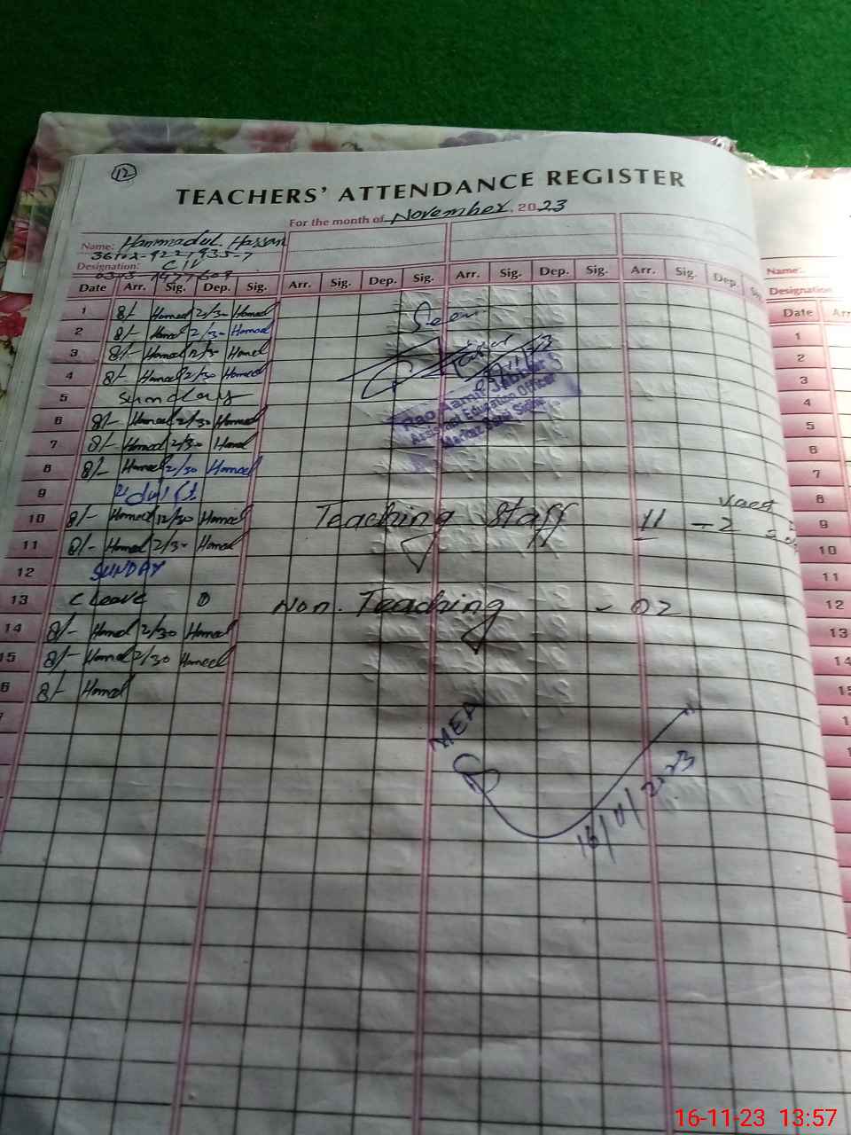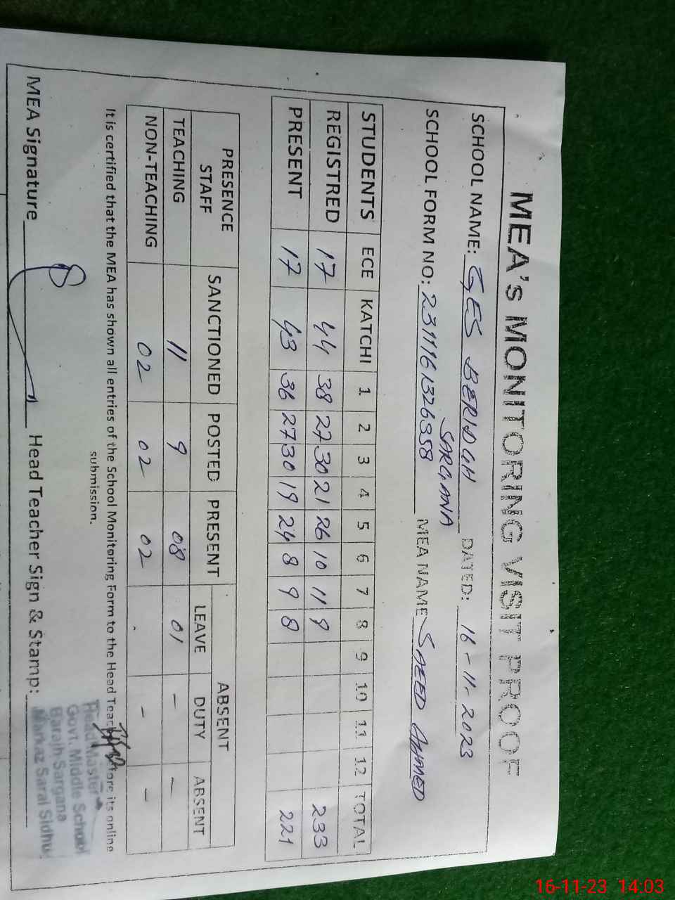 | Attendance Register | Head Teacher | MEA with School | Visit Proof |