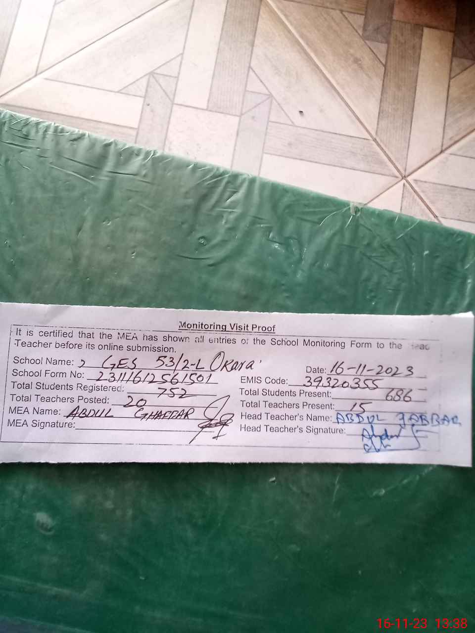 | Attendance Register | Head Teacher | MEA with School | Visit Proof |