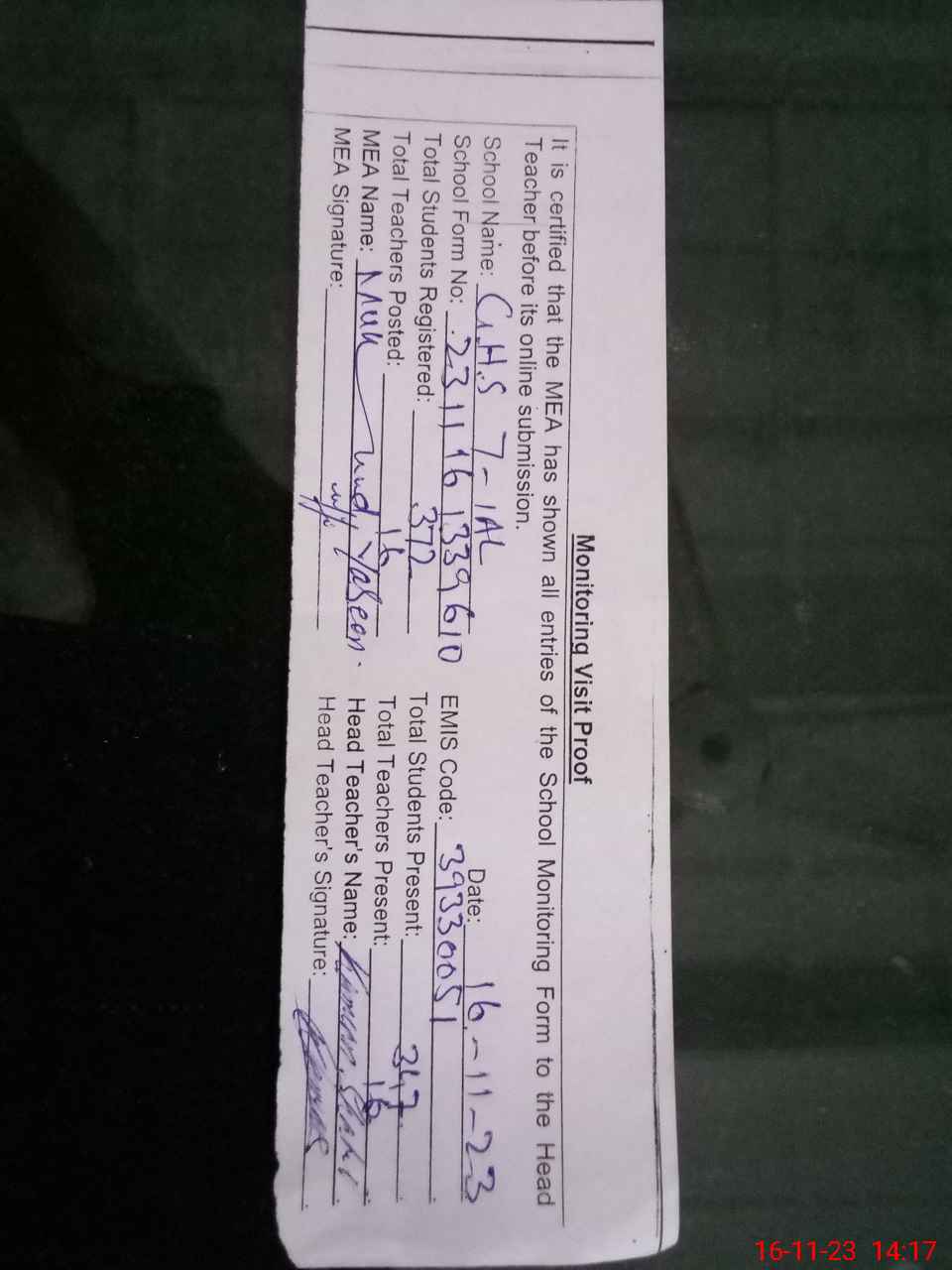 | Attendance Register | Head Teacher | MEA with School | Visit Proof |