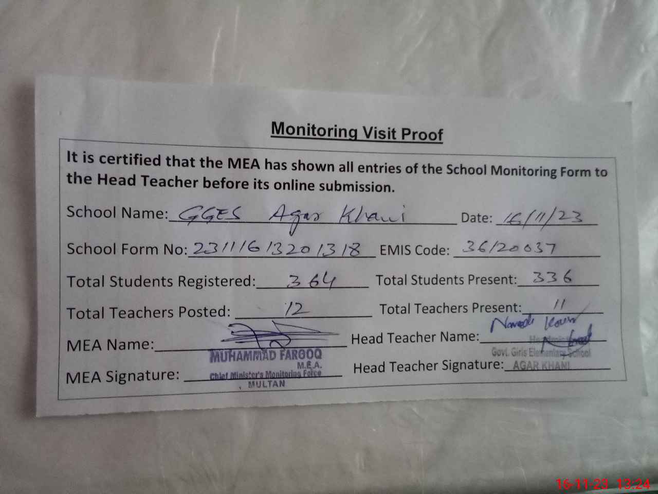 | Attendance Register | Head Teacher | MEA with School | Visit Proof |