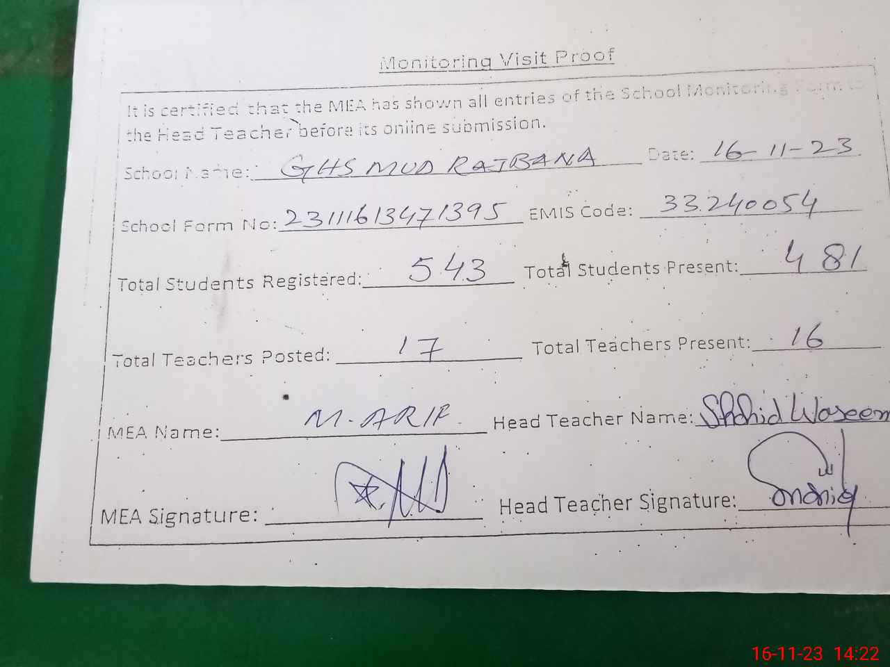 | Attendance Register | Head Teacher | MEA with School | Visit Proof |