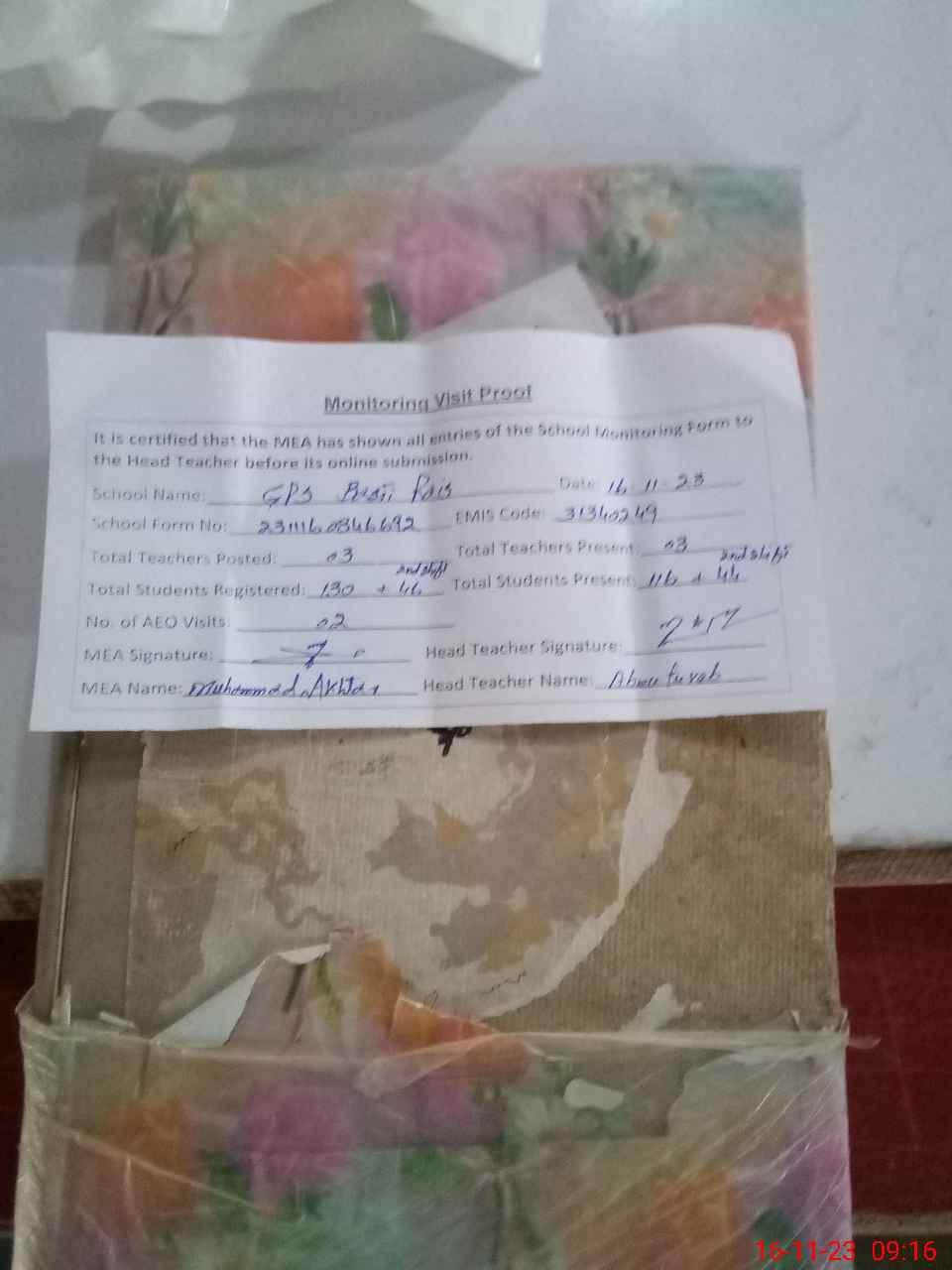 | Attendance Register | Head Teacher | MEA with School | Visit Proof |