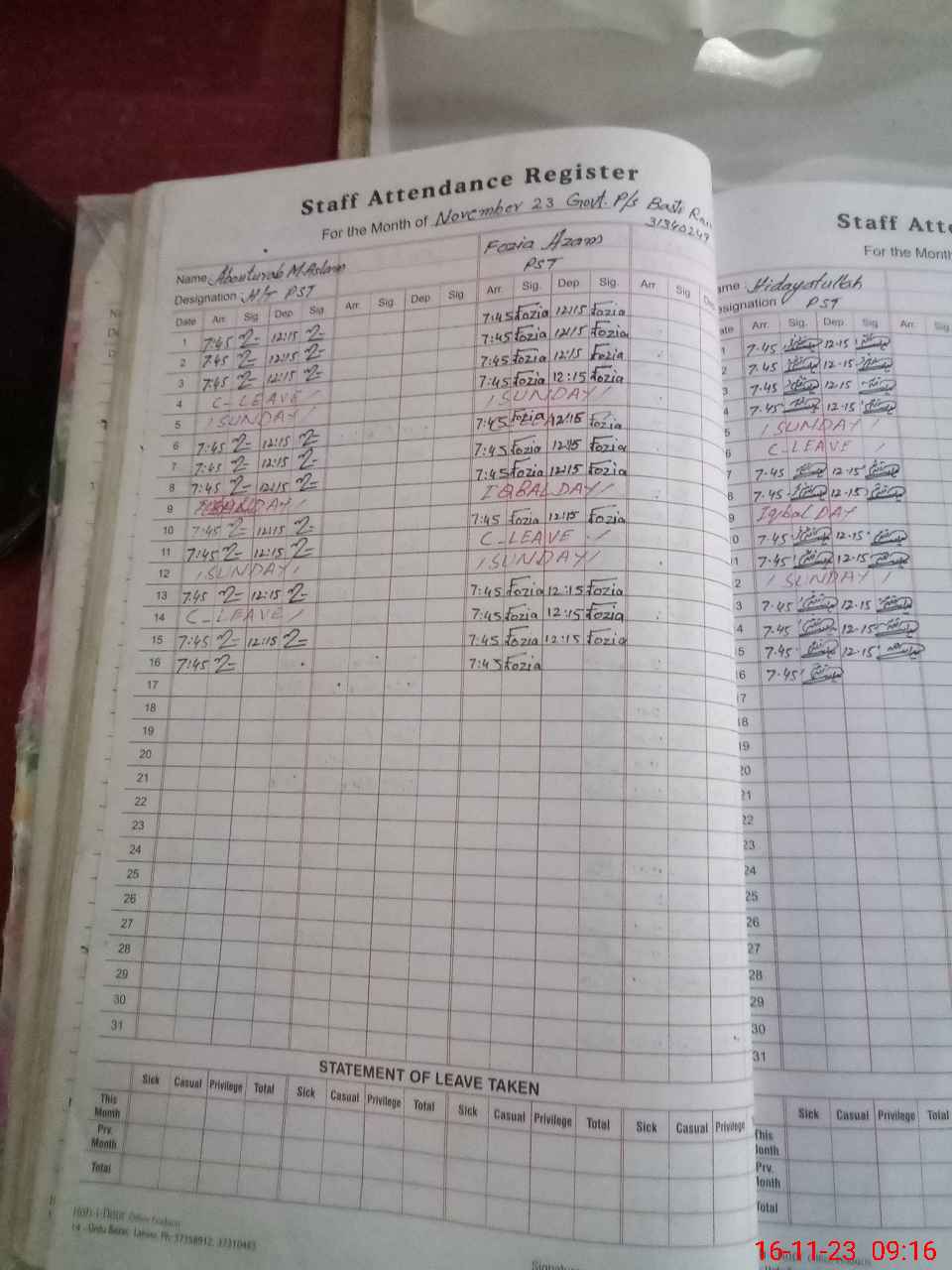 | CNIC | Full Name | Designation | R/C | Absence During Last Calender Month |