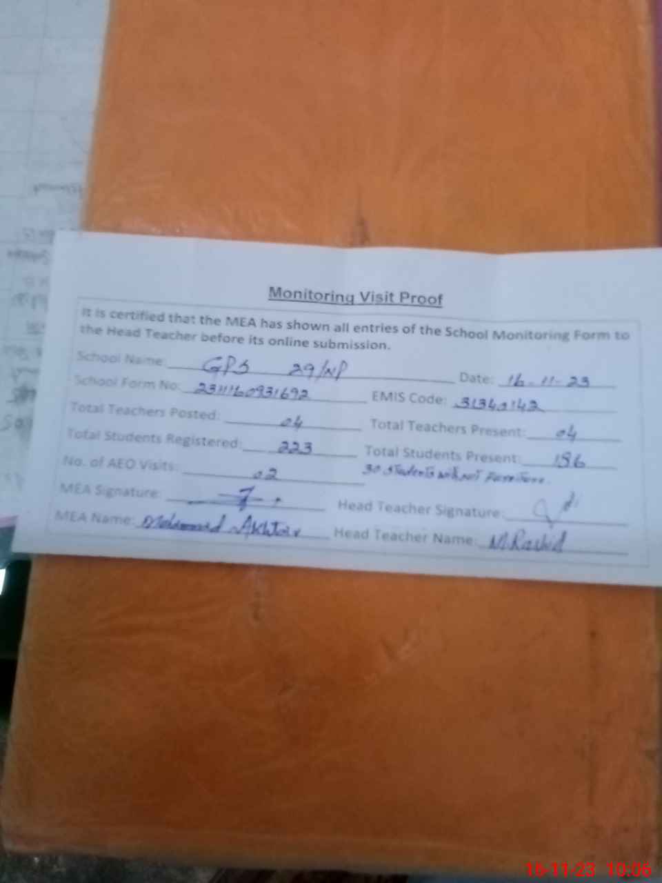 | Attendance Register | Head Teacher | MEA with School | Visit Proof |