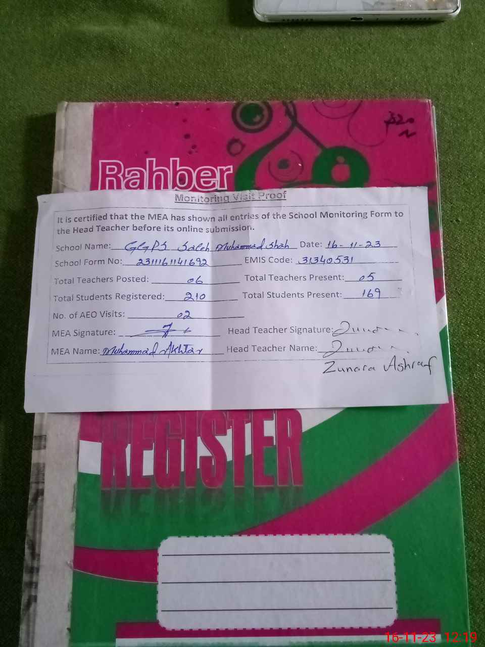 | Attendance Register | Head Teacher | MEA with School | Visit Proof |