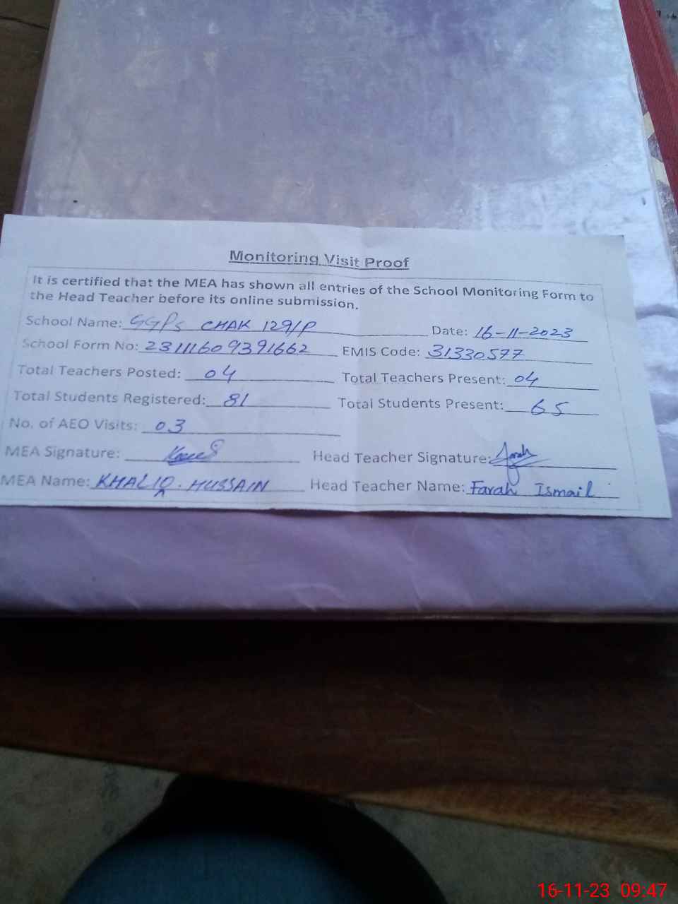 | EMIS Code: 31330577 | Name of School: GGPS CHAK 129/P | |||