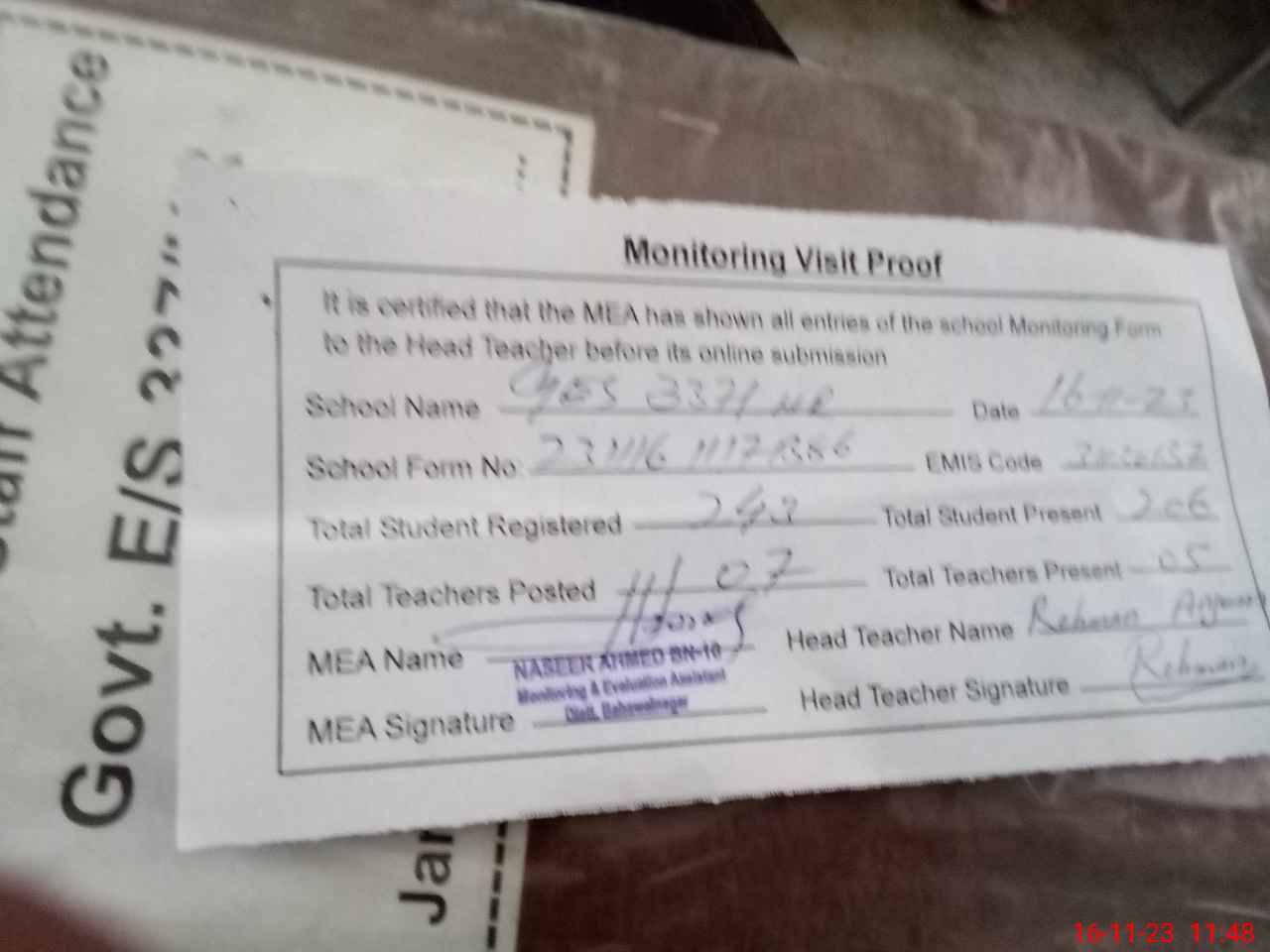 | Attendance Register | Head Teacher | MEA with School | Visit Proof |