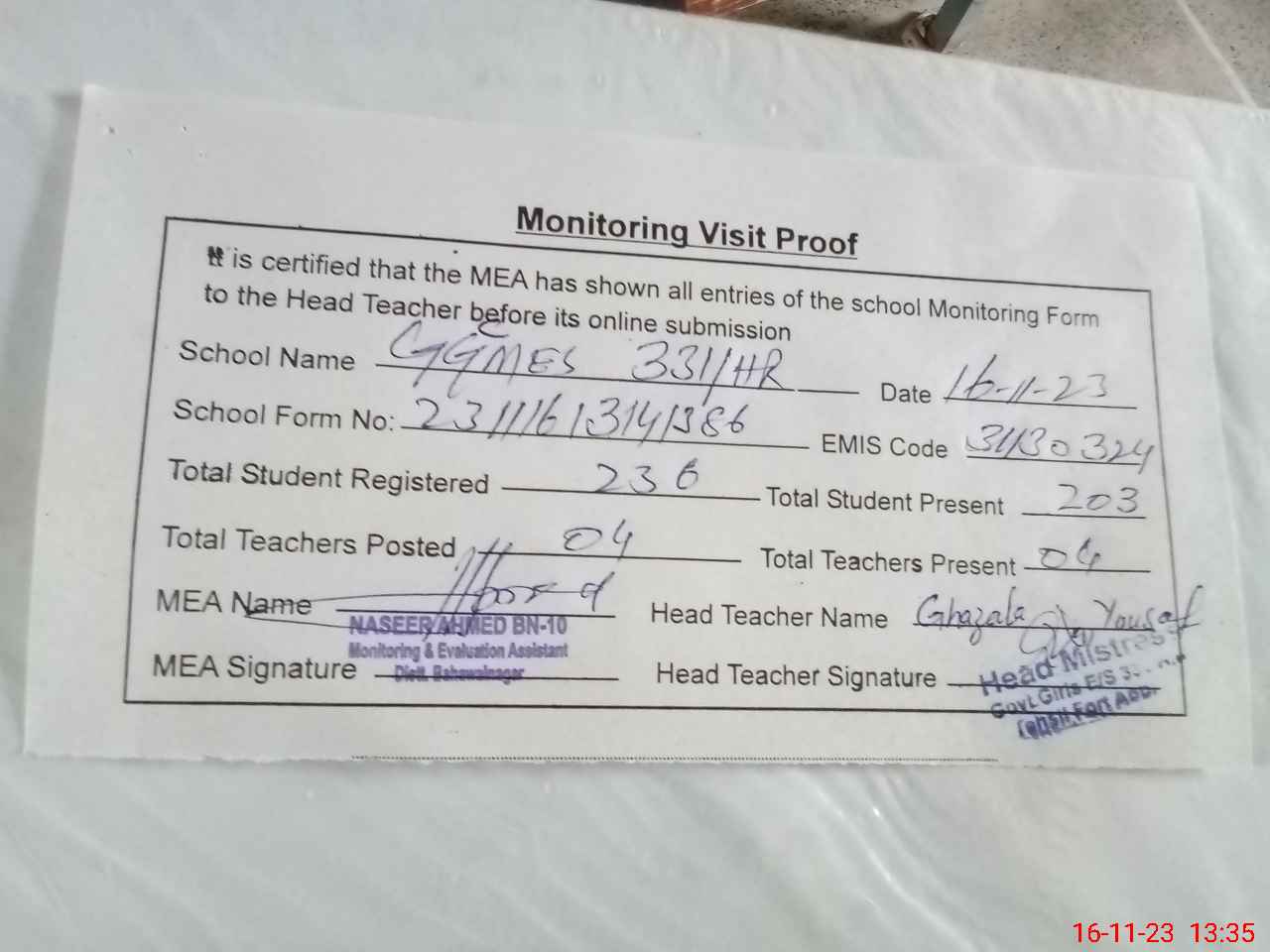 | EMIS Code: 31130324 | Name of School: GGCMES CHAK NO 331 HR | |||