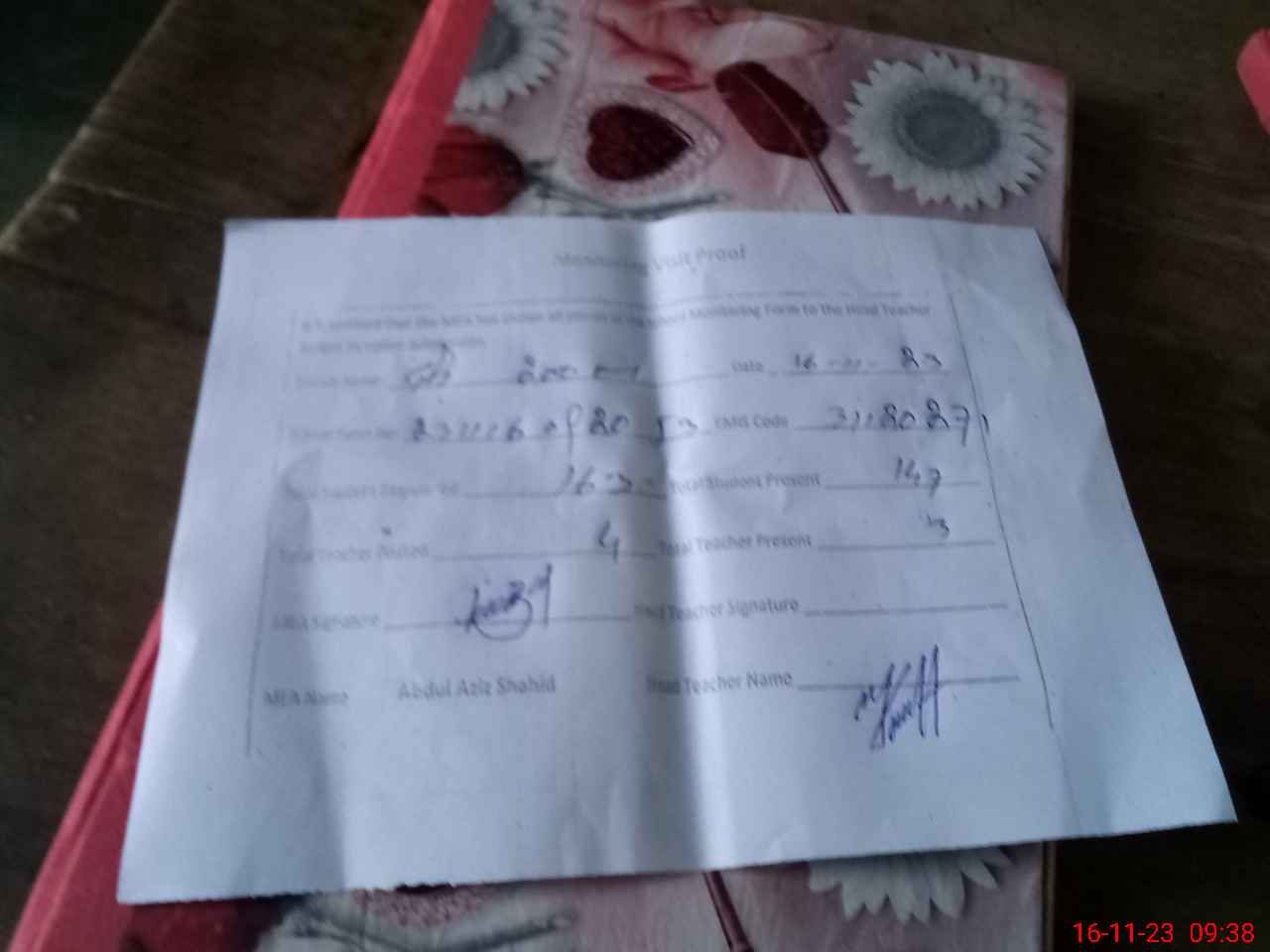 | Attendance Register | Head Teacher | MEA with School | Visit Proof |
