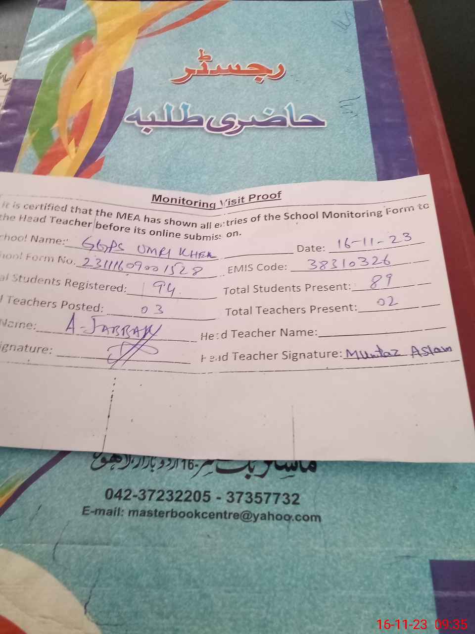 | Attendance Register | Head Teacher | MEA with School | Visit Proof |