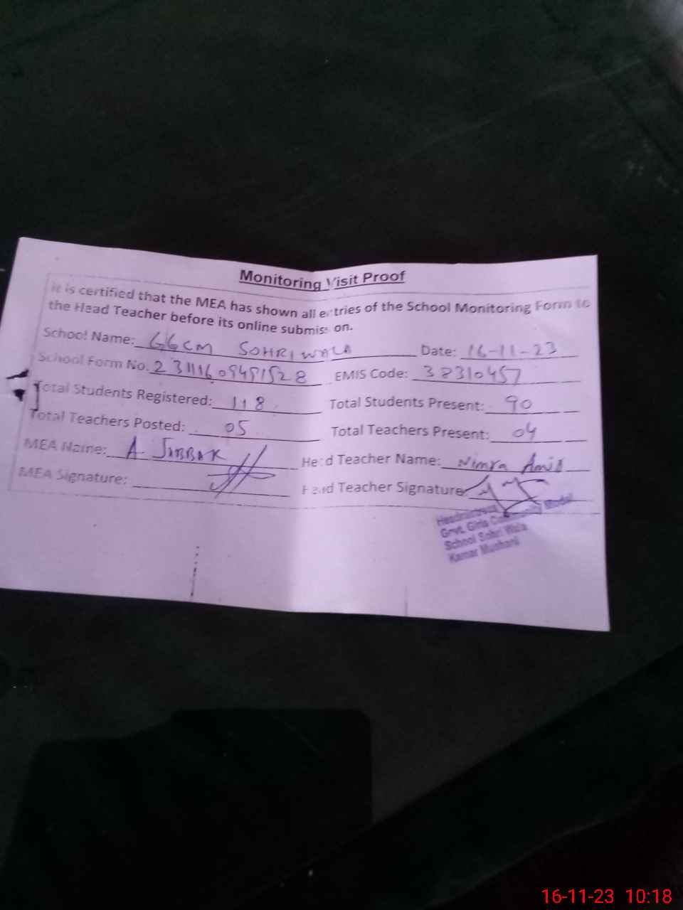 | Attendance Register | Head Teacher | MEA with School | Visit Proof |