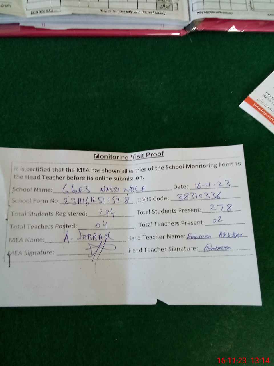 | Attendance Register | Head Teacher | MEA with School | Visit Proof |