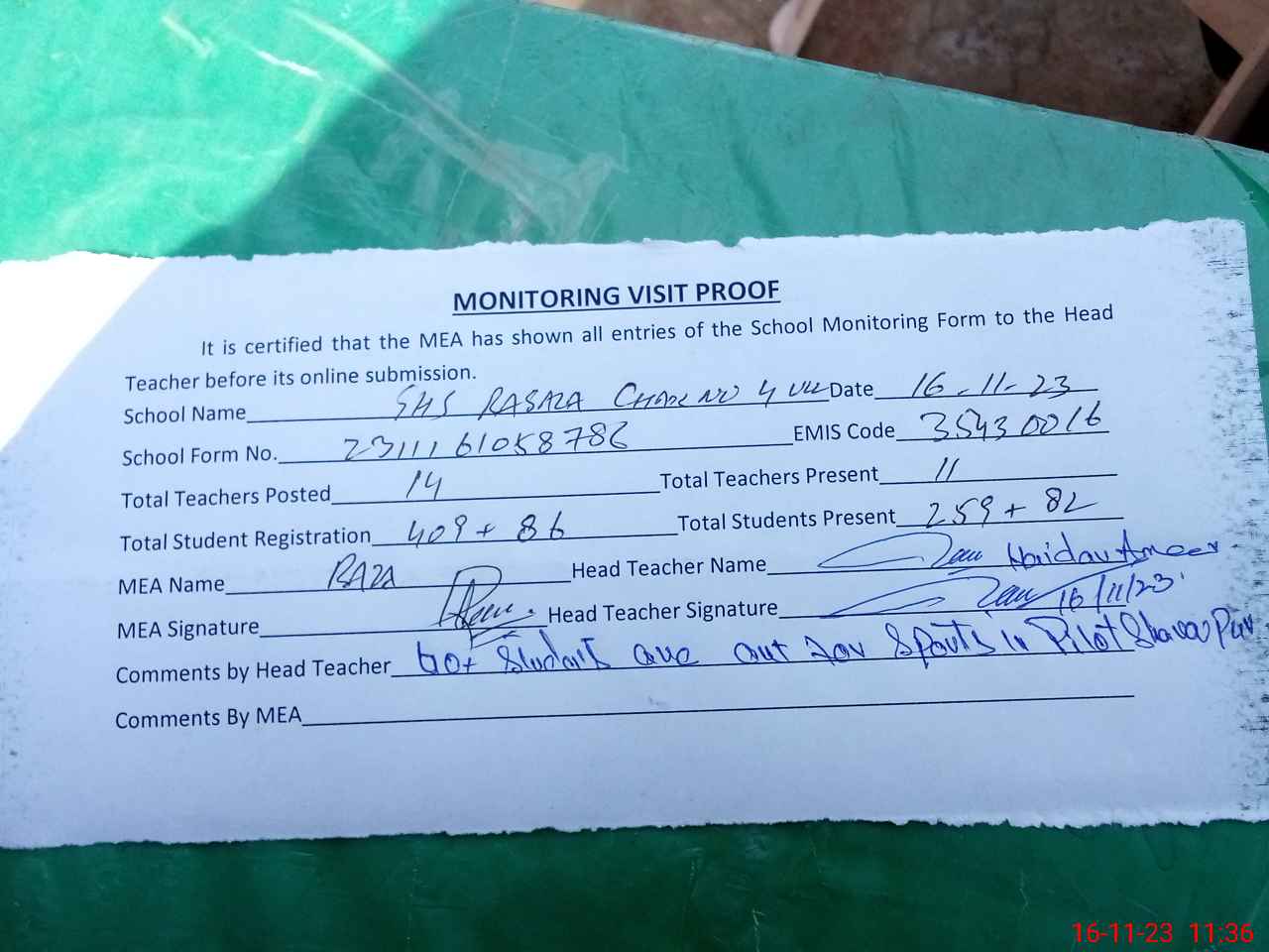 | EMIS Code: 35430016 | Name of School: GHS RASALA CHAK NO. 4 | |||