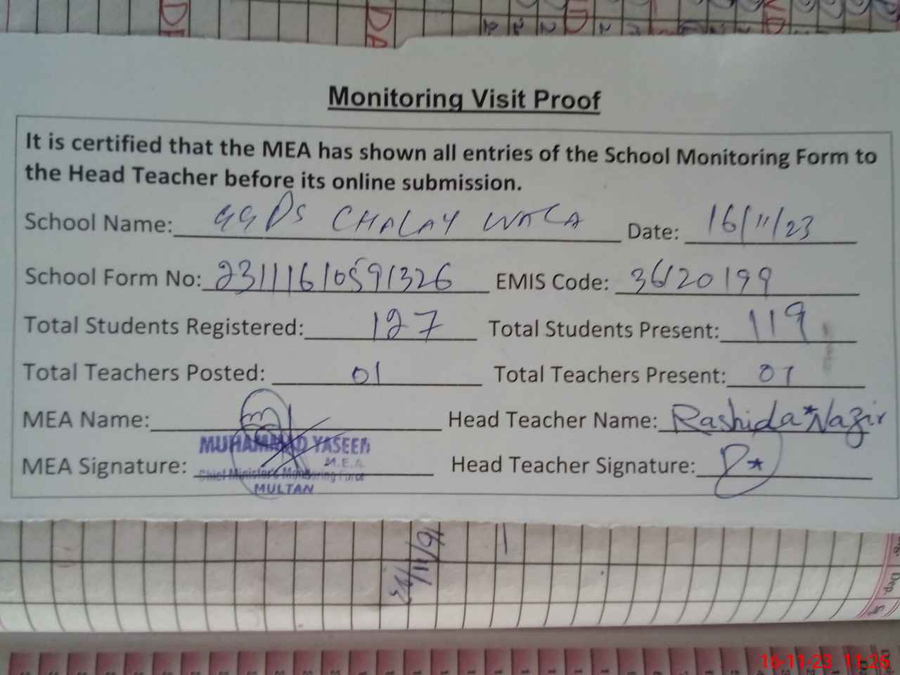 | Attendance Register | Head Teacher | MEA with School | Visit Proof |