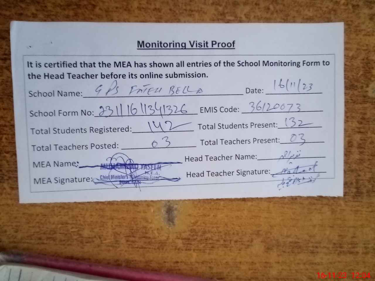 | Attendance Register | Head Teacher | MEA with School | Visit Proof |