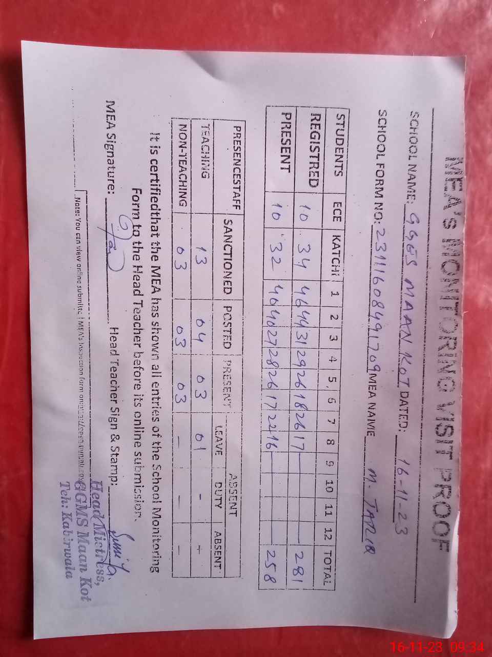 | Attendance Register | Head Teacher | MEA with School | Visit Proof |
