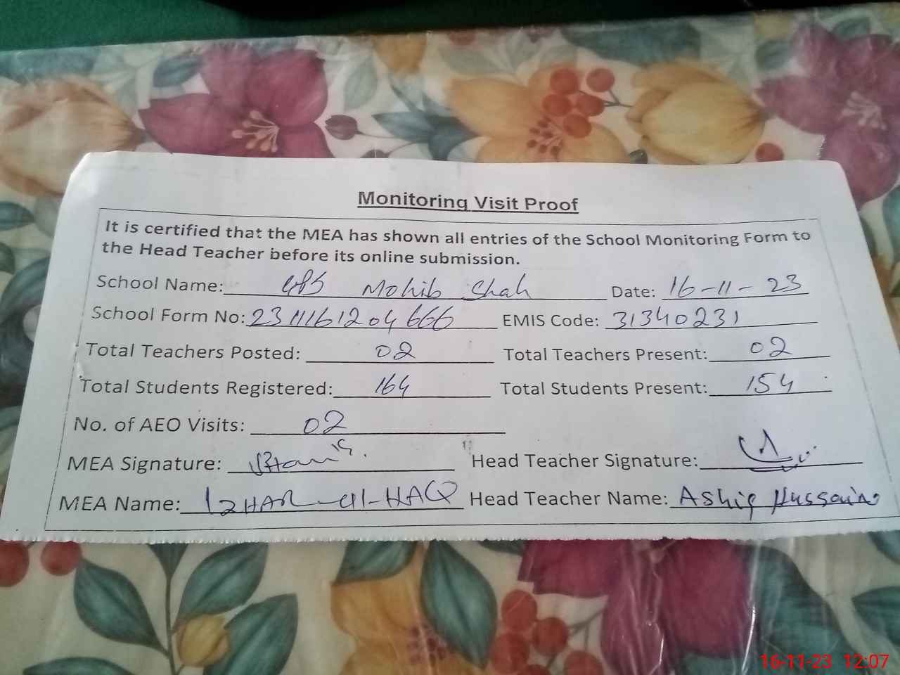 | Attendance Register | Head Teacher | MEA with School | Visit Proof |