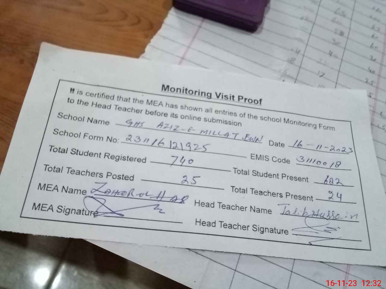 | EMIS Code: 31110018 | Name of School: GHS AZIZ E MILLAT BWN | |||