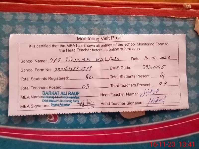 | EMIS Code: 39210295 | Name of School: GPS TIWANA KALAN | |||