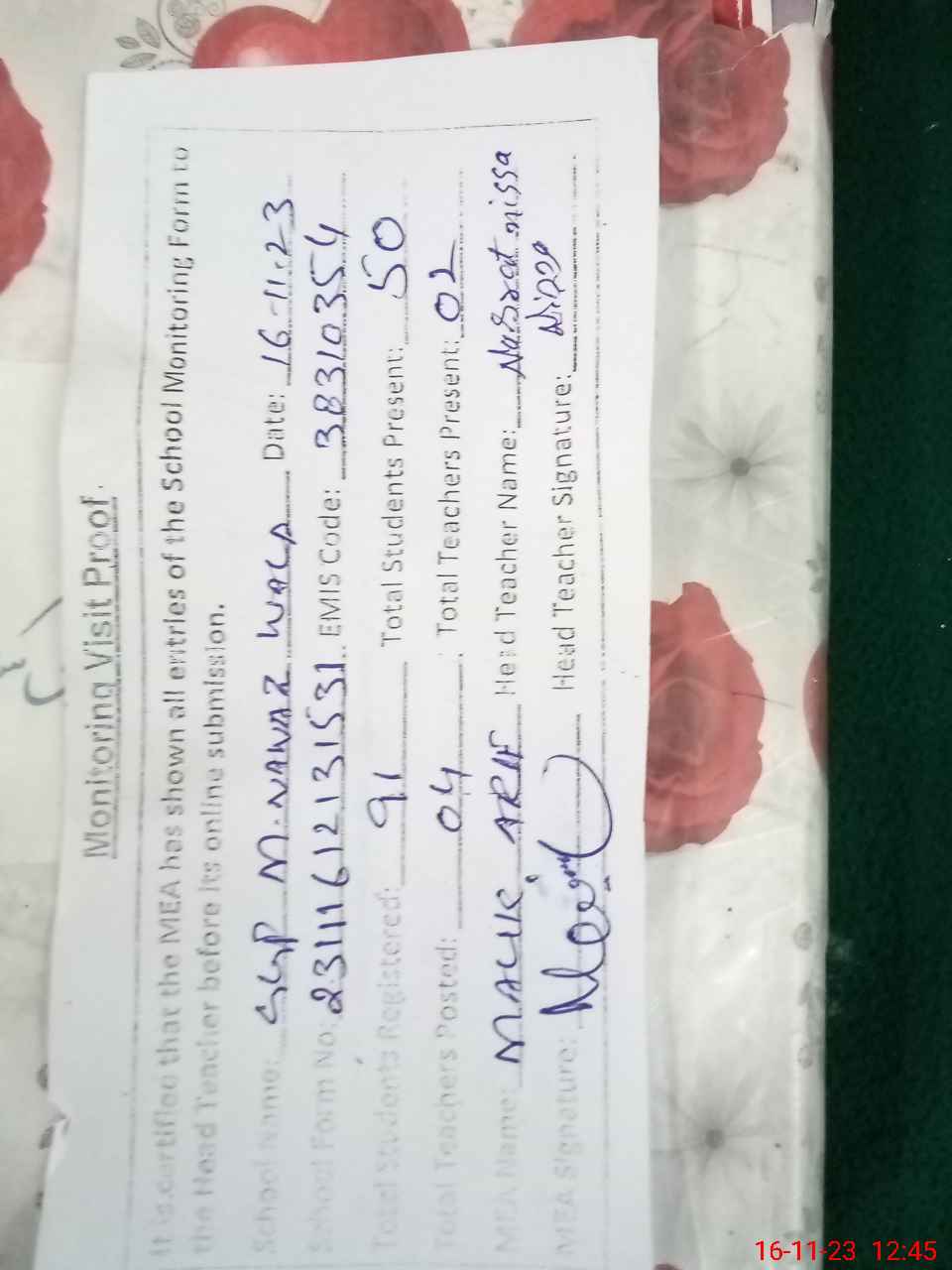 | Attendance Register | Head Teacher | MEA with School | Visit Proof |