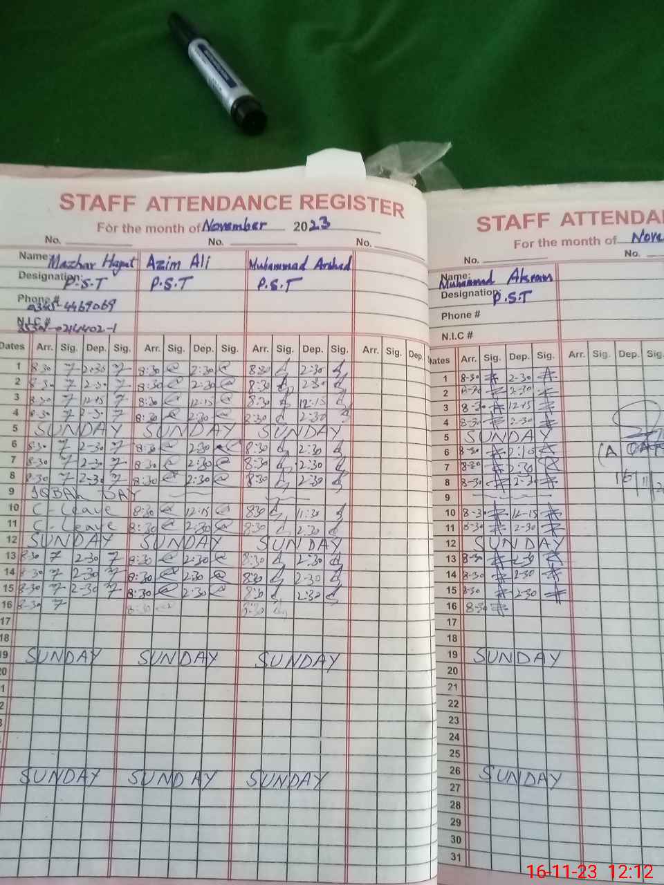 | CNIC | Full Name | Designation | R/C | Absence During Last Calender Month |