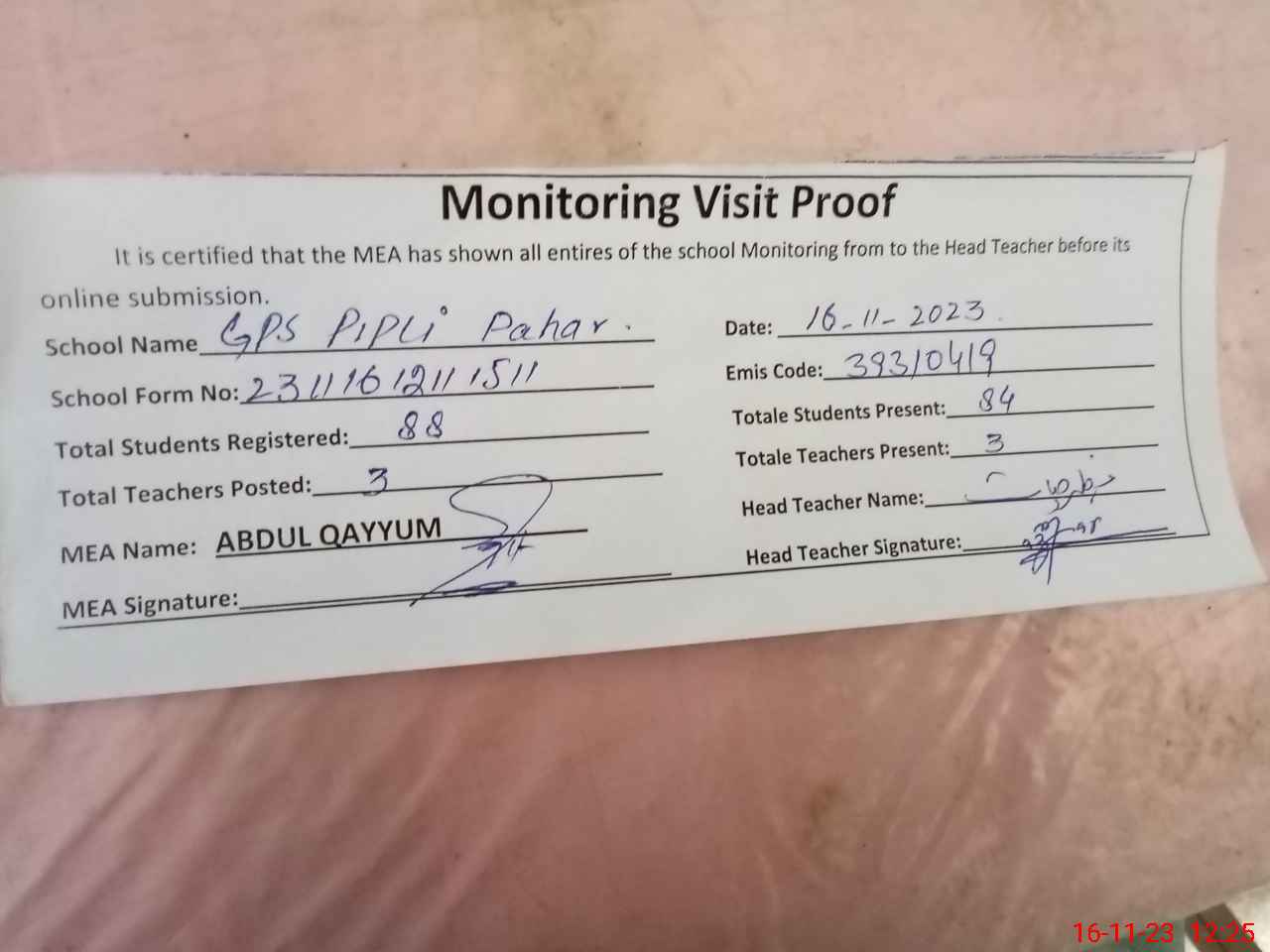 | Attendance Register | Head Teacher | MEA with School | Visit Proof |