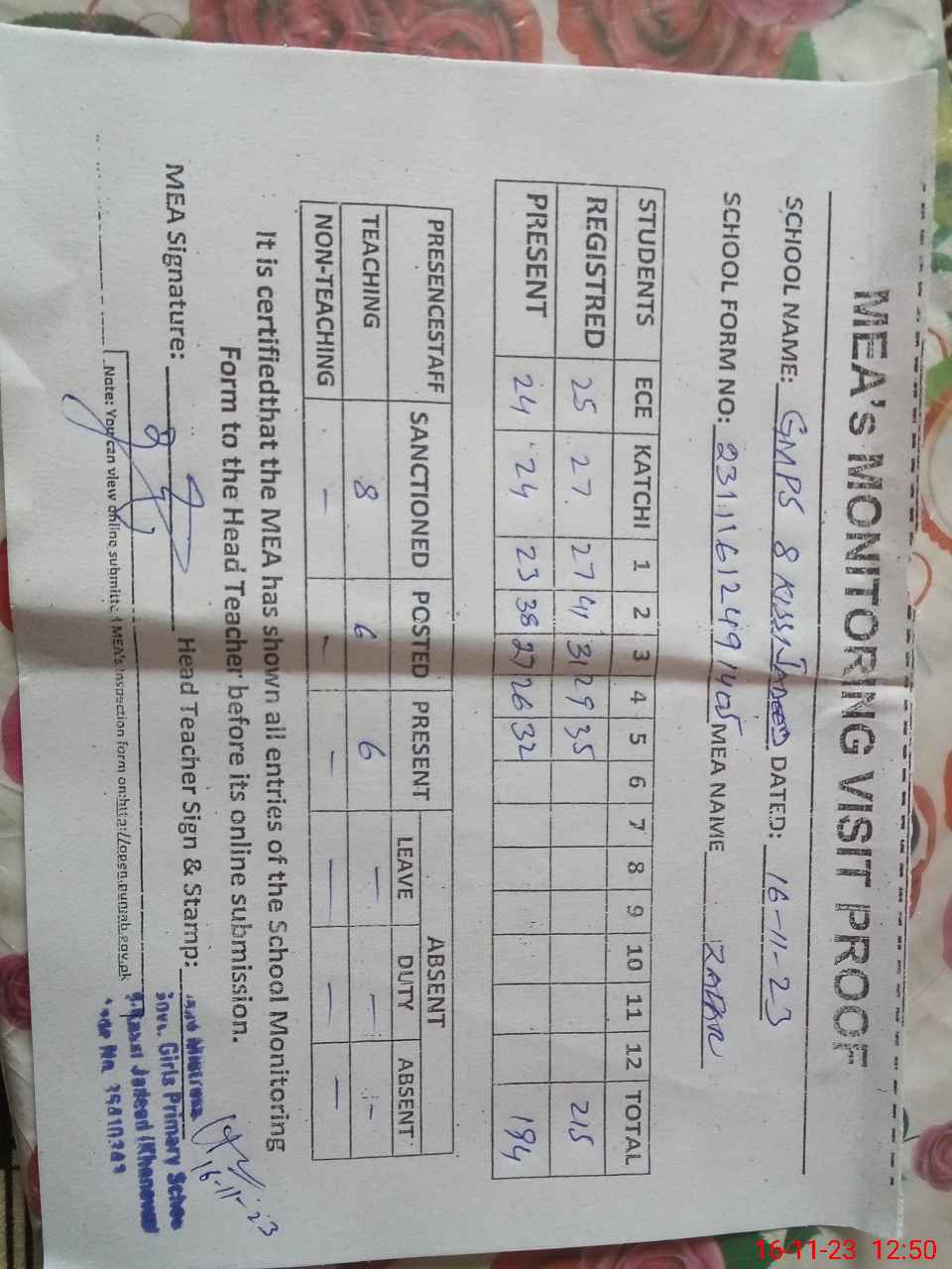 | Attendance Register | Head Teacher | MEA with School | Visit Proof |