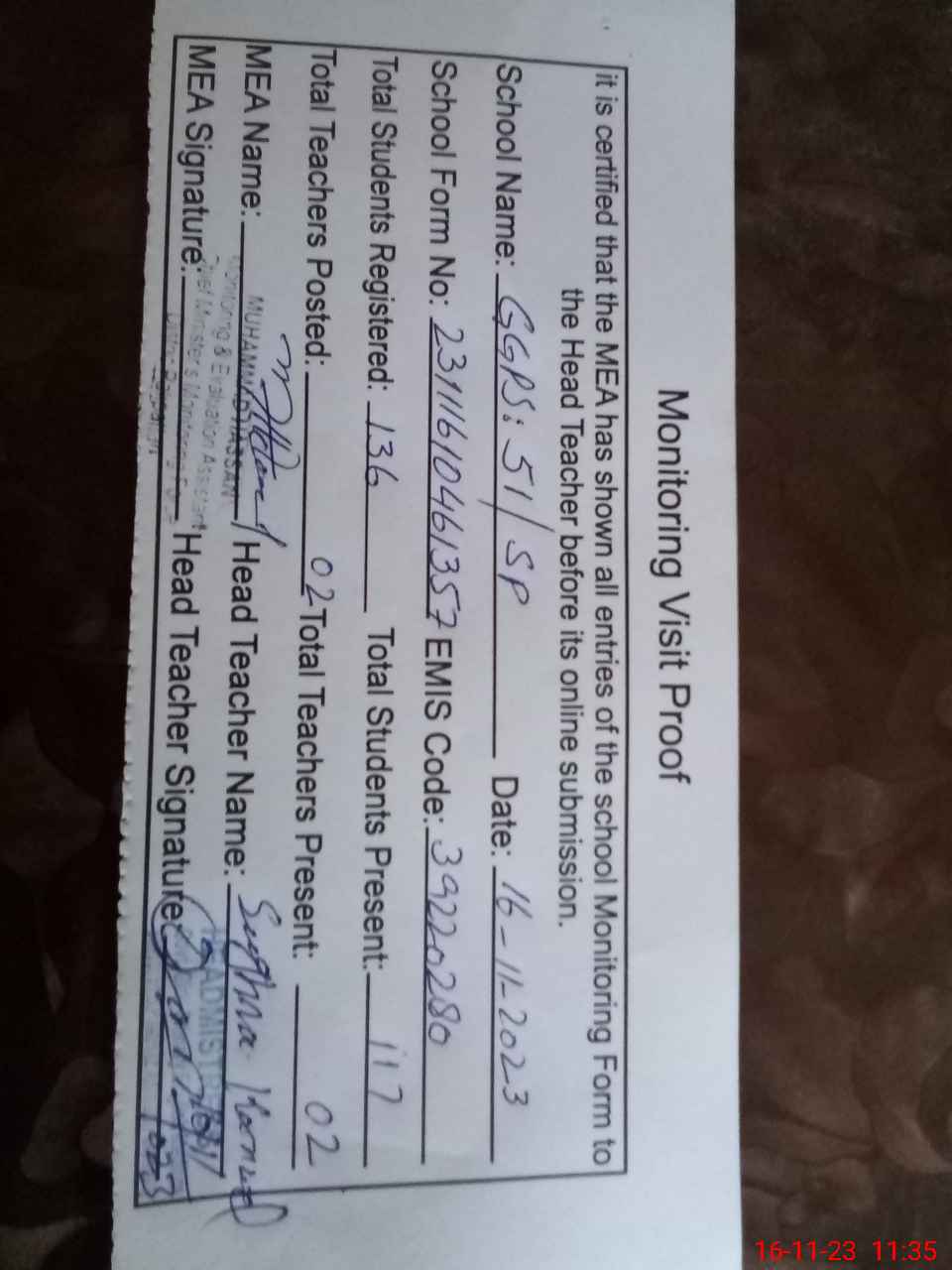 | EMIS Code: 39220280 | Name of School: GGPS 51 SP POST OFFICE JEVAN SHAH | |||