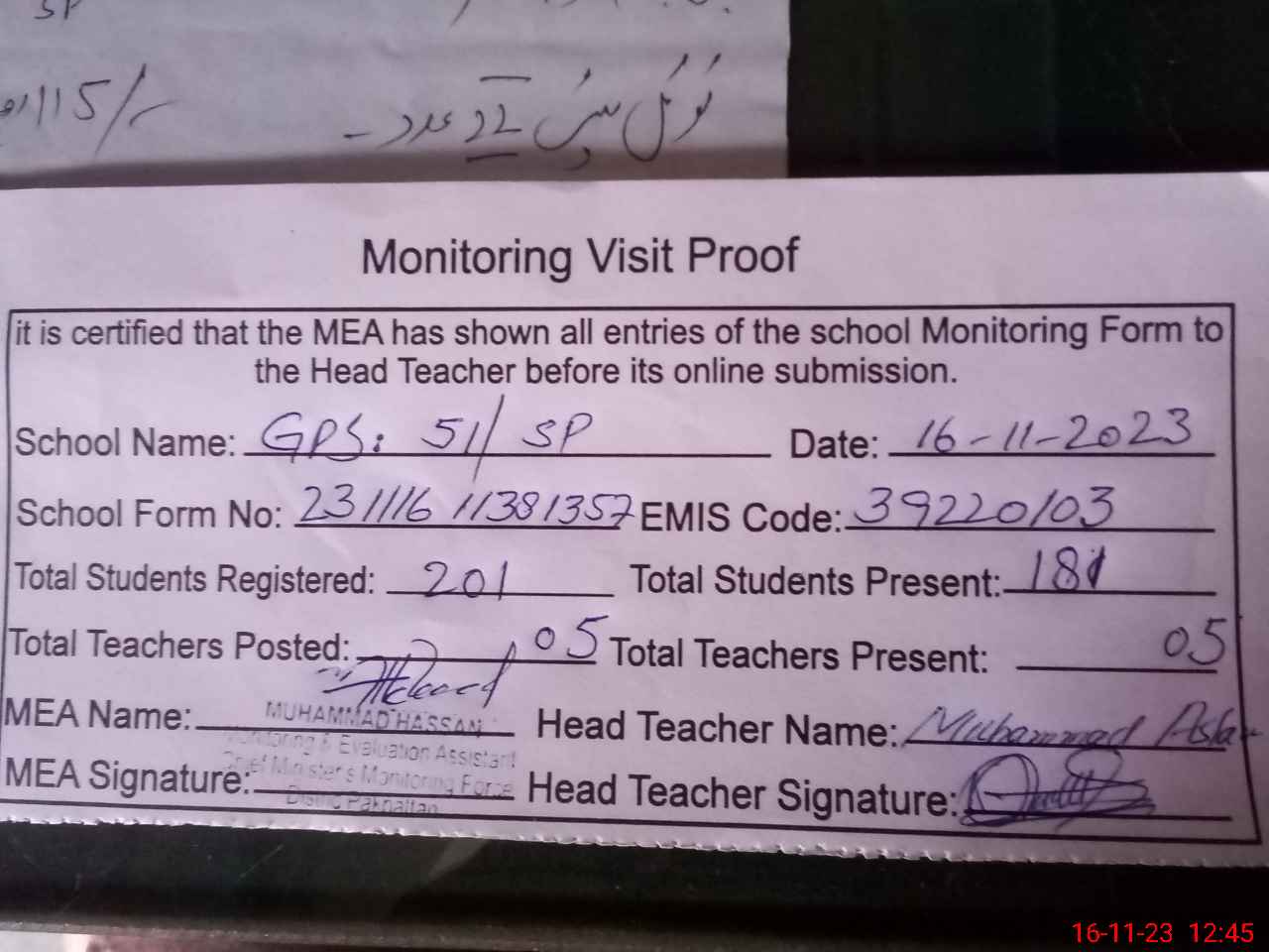| EMIS Code: 39220103 | Name of School: GPS 51 SP P.O BANGLA JIWAN SHAH | |||