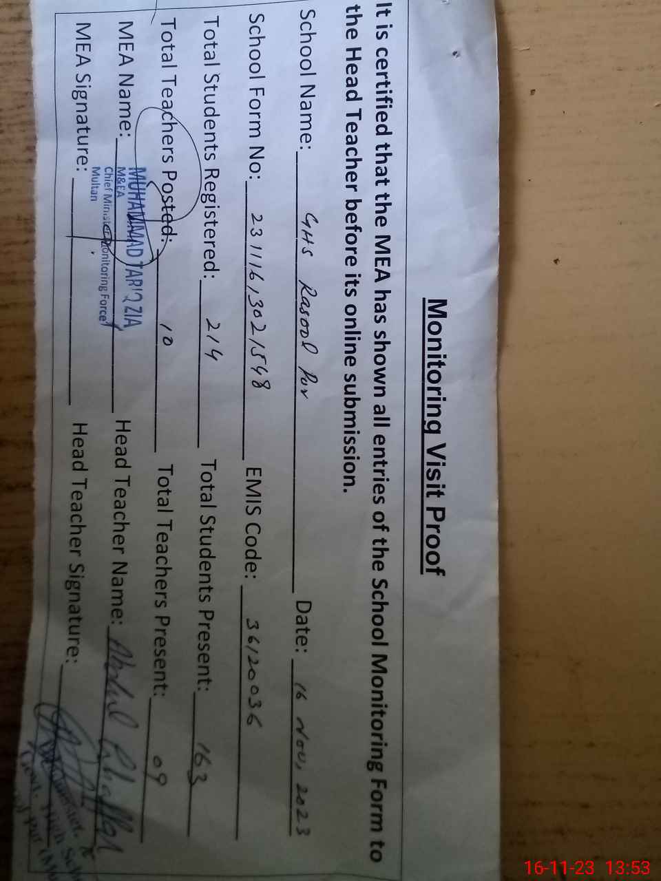 | Attendance Register | Head Teacher | MEA with School | Visit Proof |