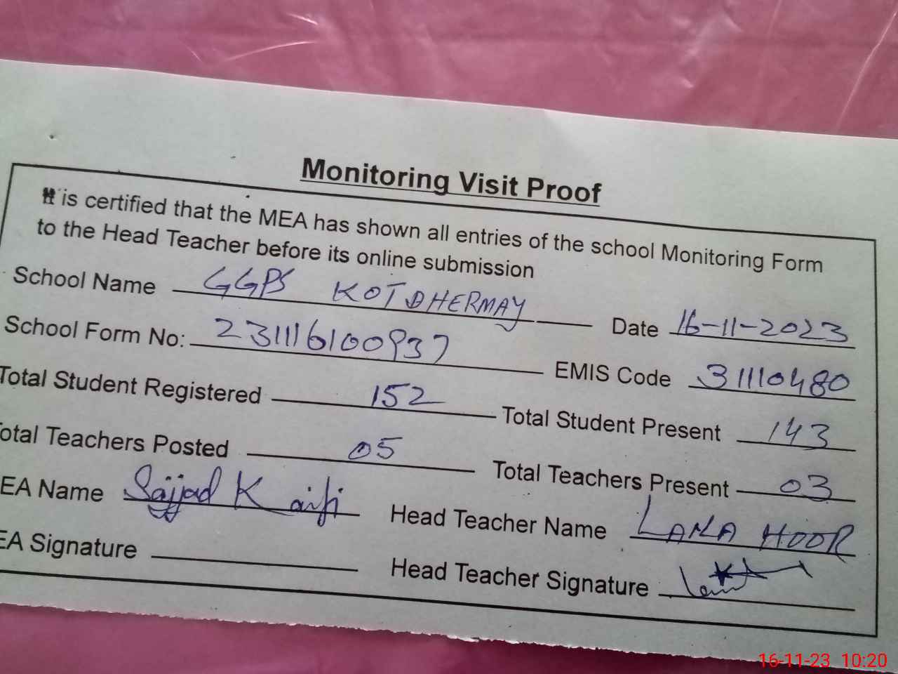 | EMIS Code: 31110480 | Name of School: GGPS KOT DHERMAY WALI | |||