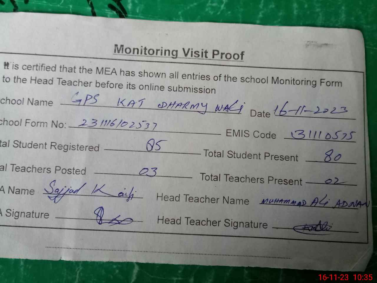 | EMIS Code: 31110575 | Name of School: GPS KAT DHARMAY WALI | |||