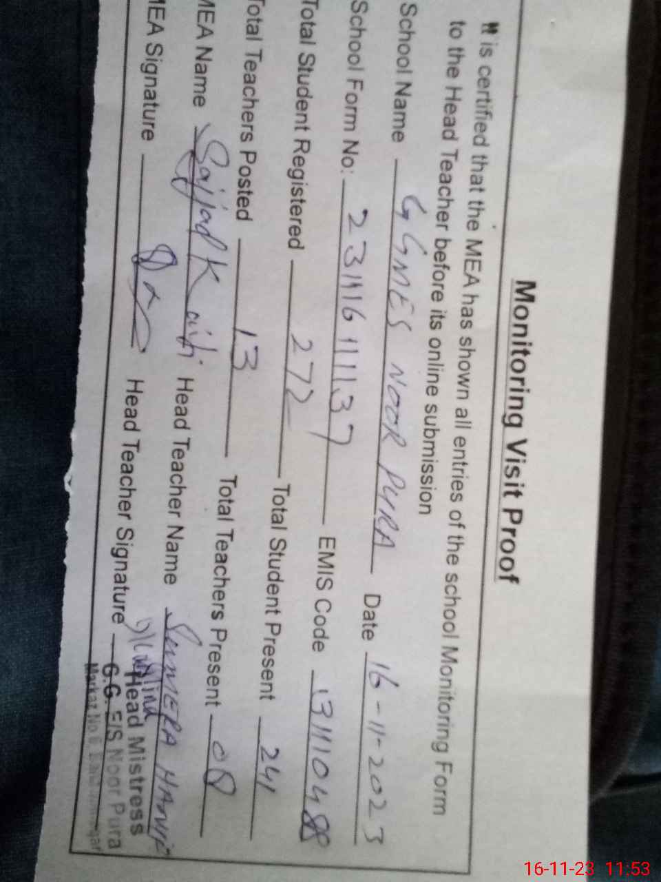 | Attendance Register | Head Teacher | MEA with School | Visit Proof |