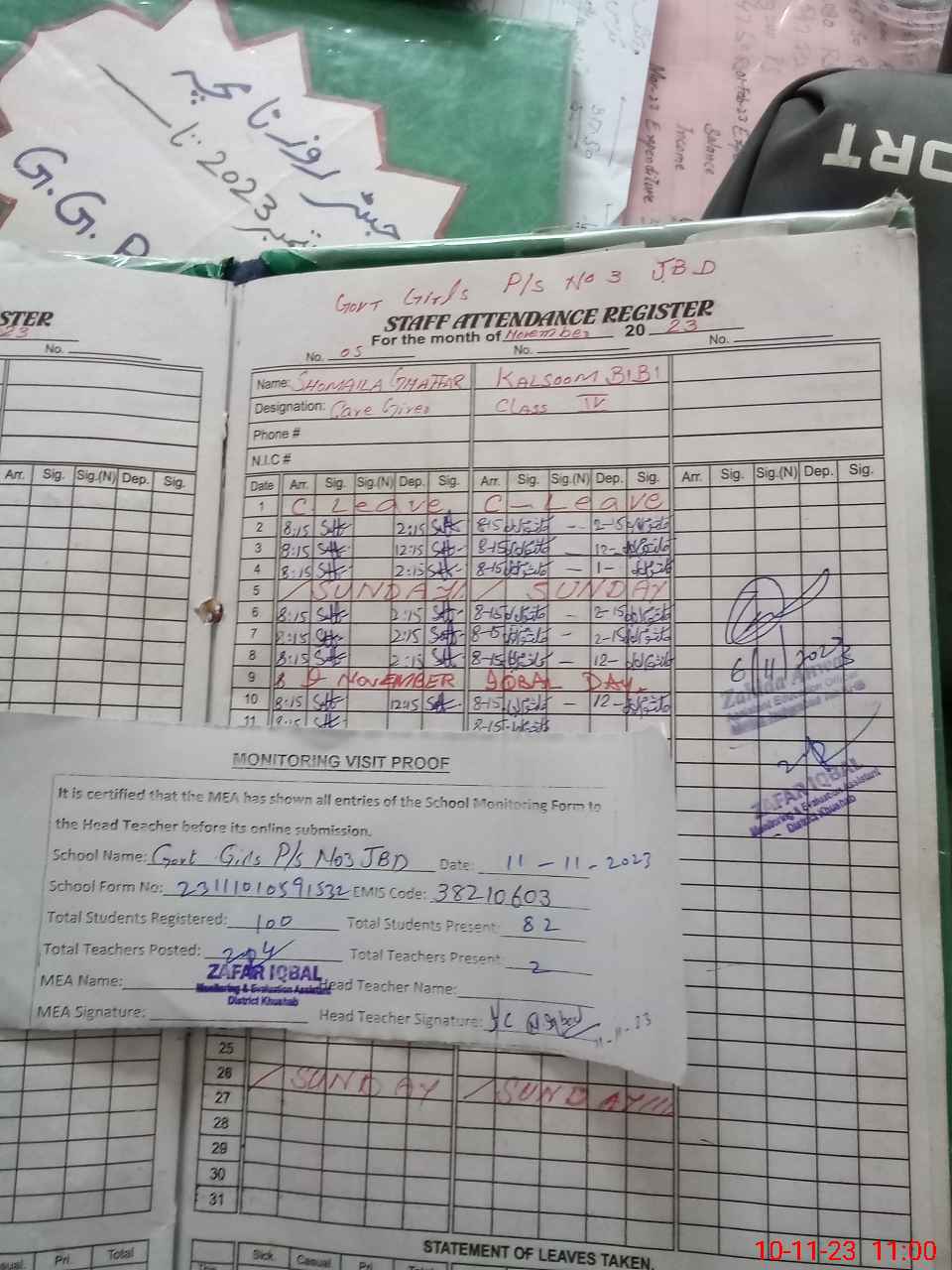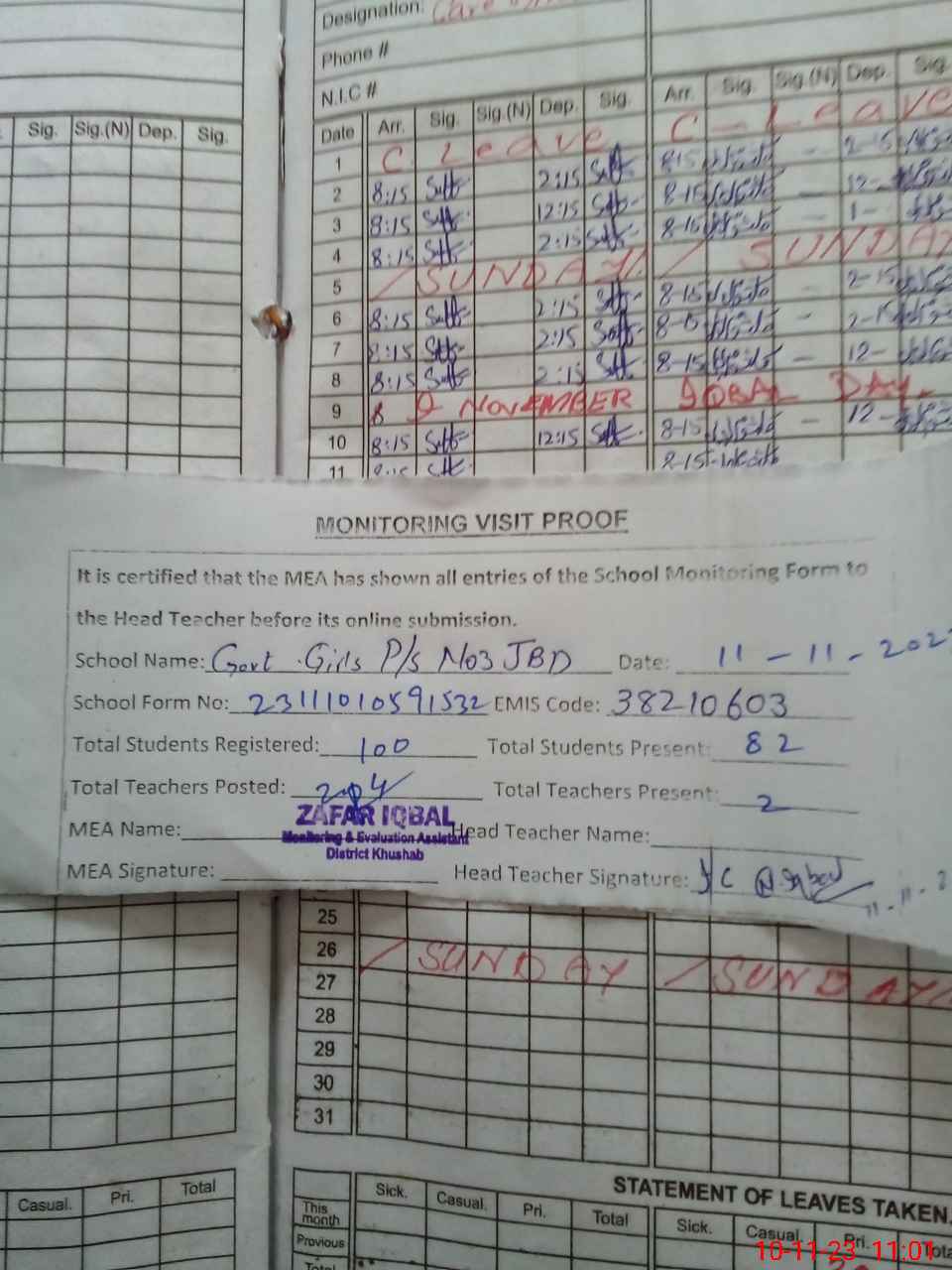 | Attendance Register | Head Teacher | MEA with School | Visit Proof |