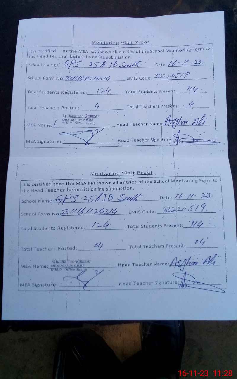 | EMIS Code: 33220519 | Name of School: GPS CHAK NO 256 JB SOUTH | |||