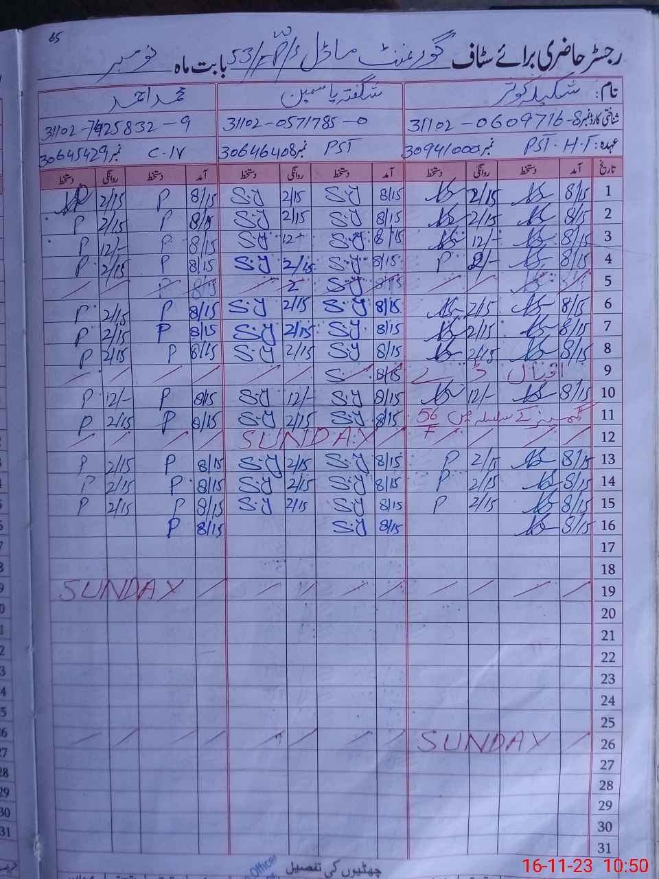 | CNIC | Full Name | Designation | R/C | Absence During Last Calender Month |