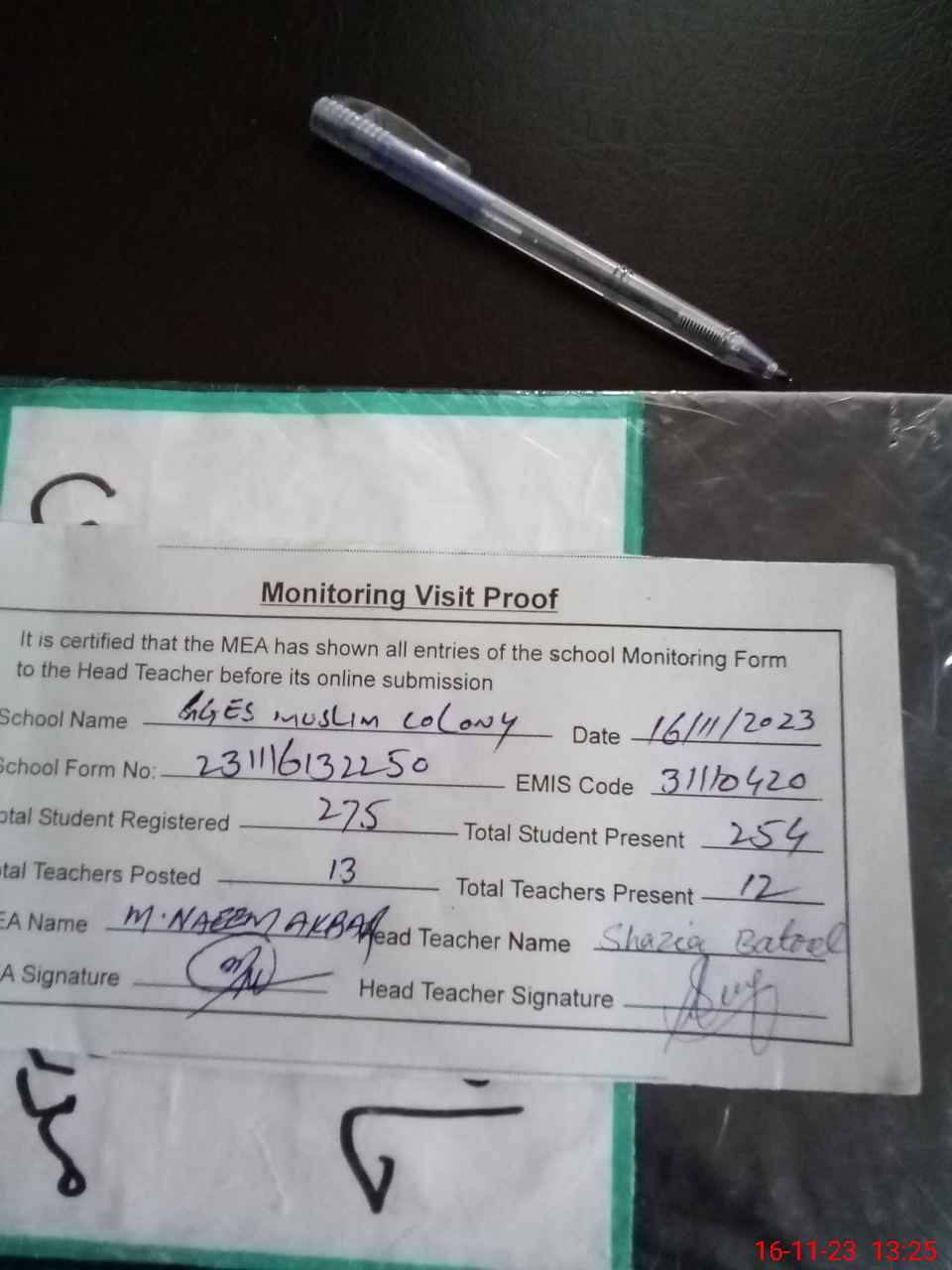 | Attendance Register | Head Teacher | MEA with School | Visit Proof |
