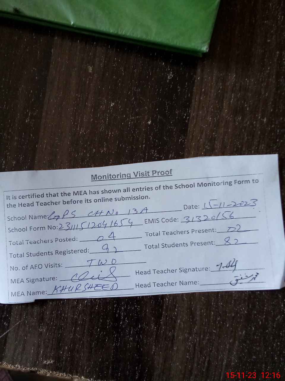 | EMIS Code: 31320156 | Name of School: GPS CHAK NO. 13/A | |||