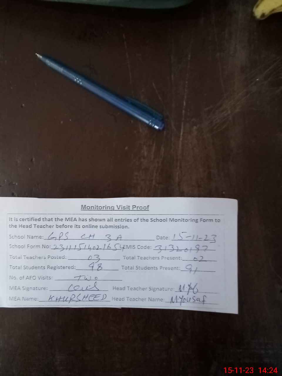 | Monitoring Date: 15-11-2023 | Start Time: 15-11-2023 02:02 PM | End Time: 15-11-2023 02:25 PM | Name of MEA: Kh**** Ah**** | |