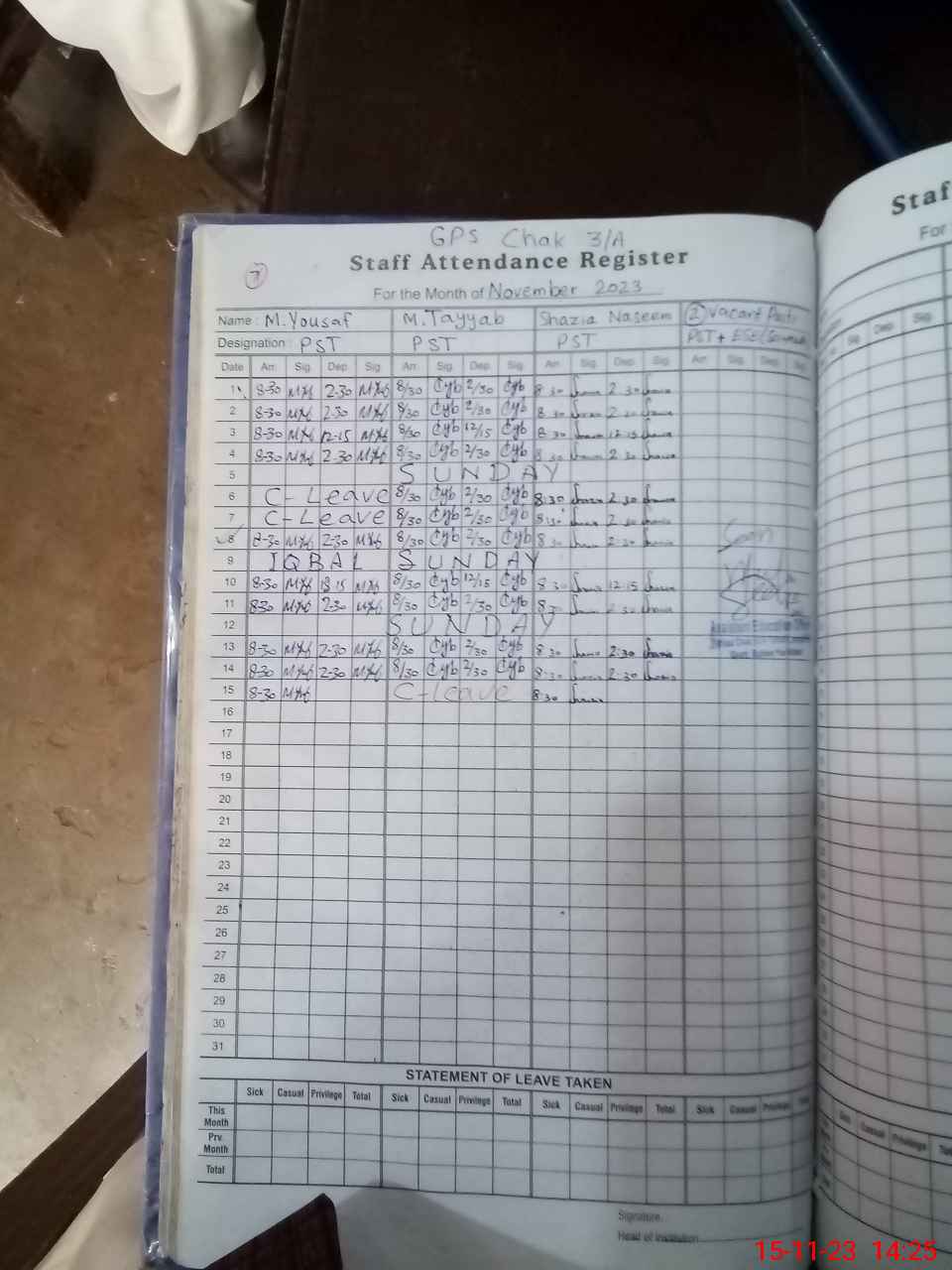 | CNIC | Full Name | Designation | R/C | Absence During Last Calender Month |