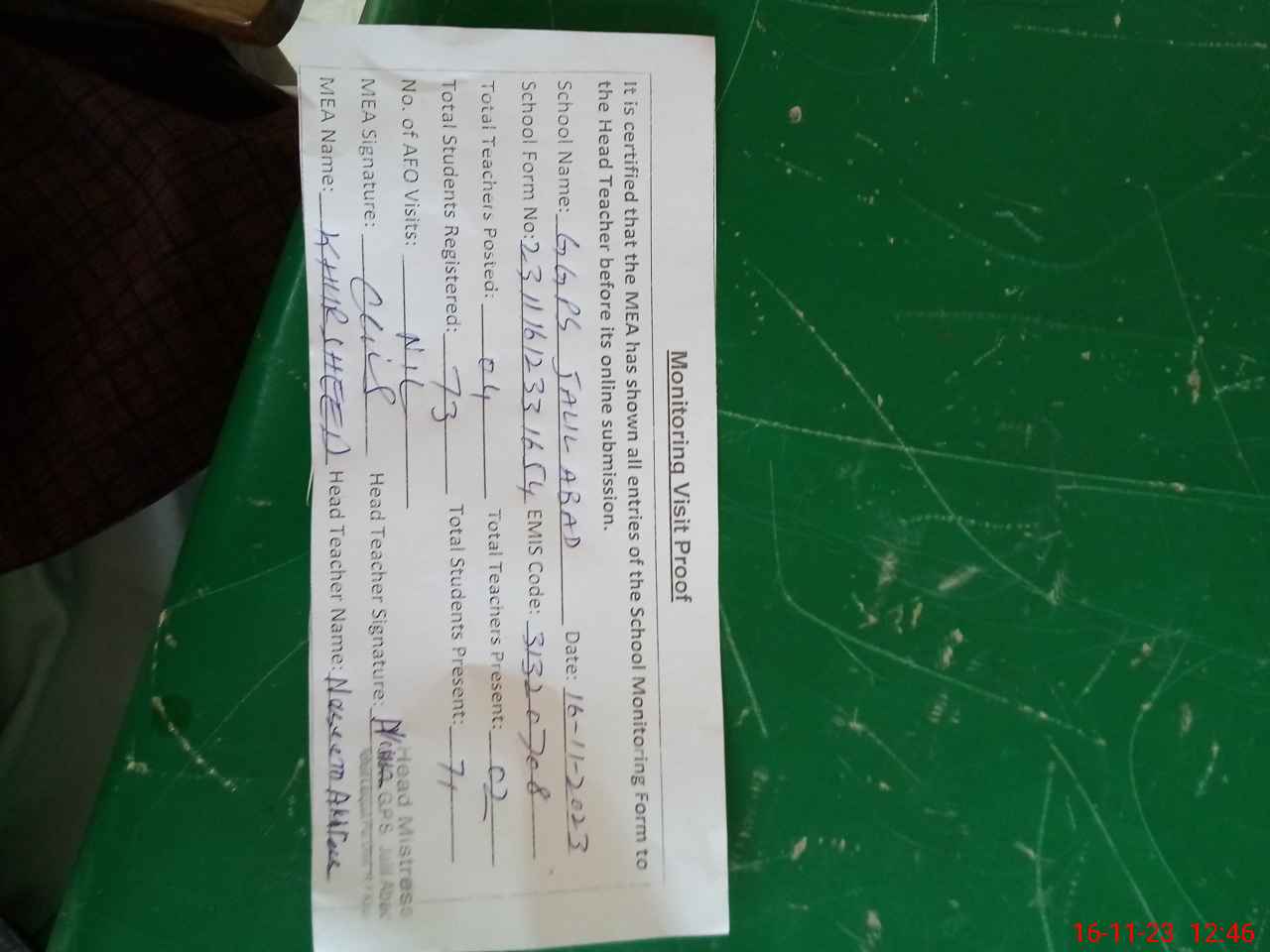 | Attendance Register | Head Teacher | MEA with School | Visit Proof |
