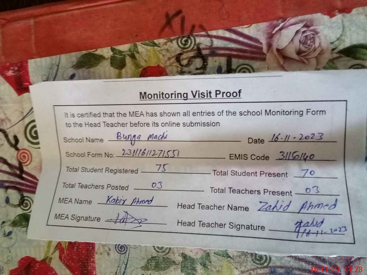 | Attendance Register | Head Teacher | MEA with School | Visit Proof |