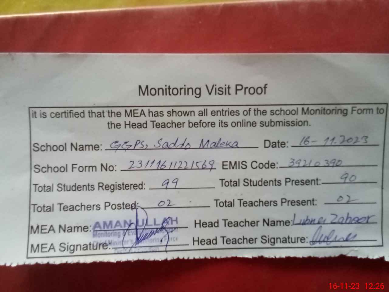 | Attendance Register | Head Teacher | MEA with School | Visit Proof |