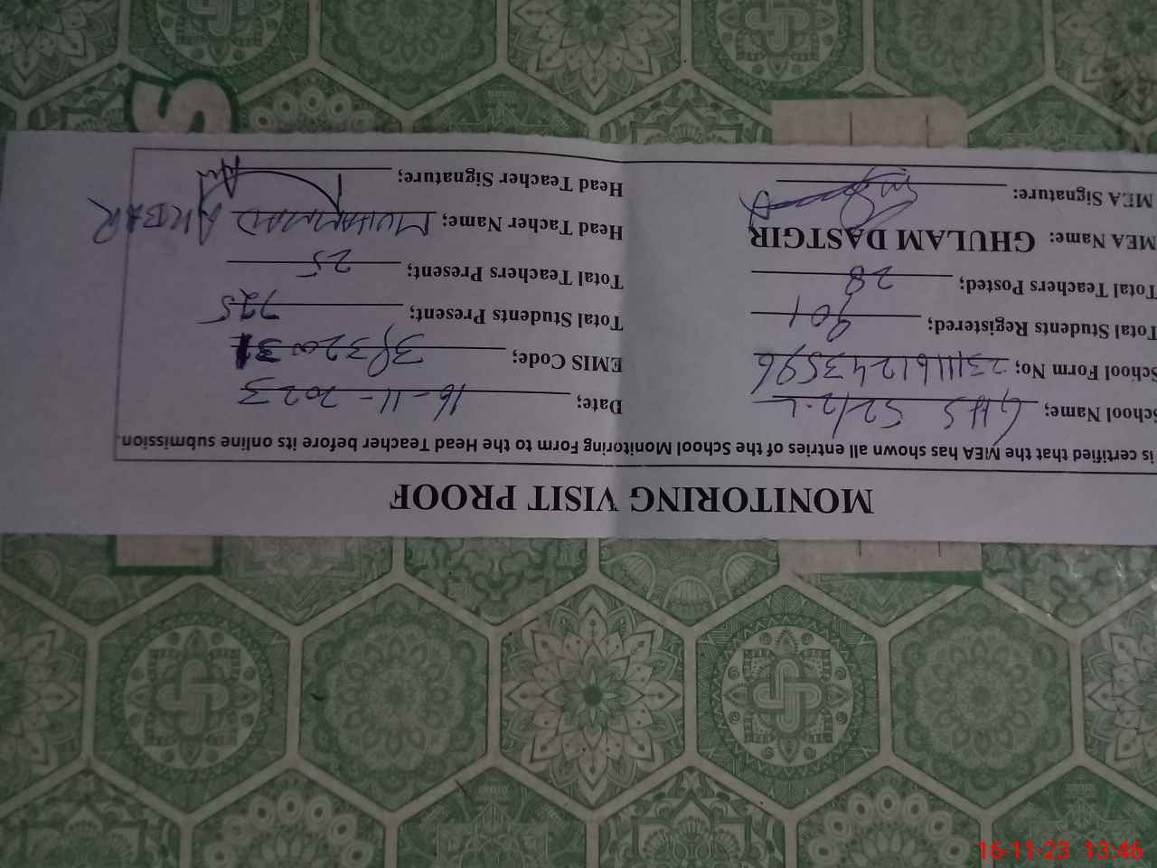 | Attendance Register | Head Teacher | MEA with School | Visit Proof |
