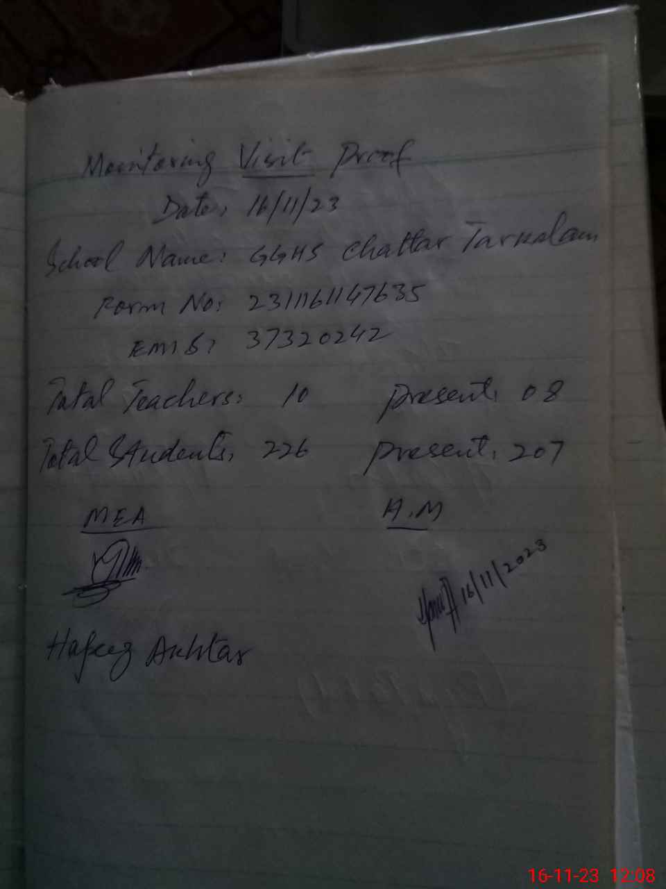 | Attendance Register | Head Teacher | MEA with School | Visit Proof |
