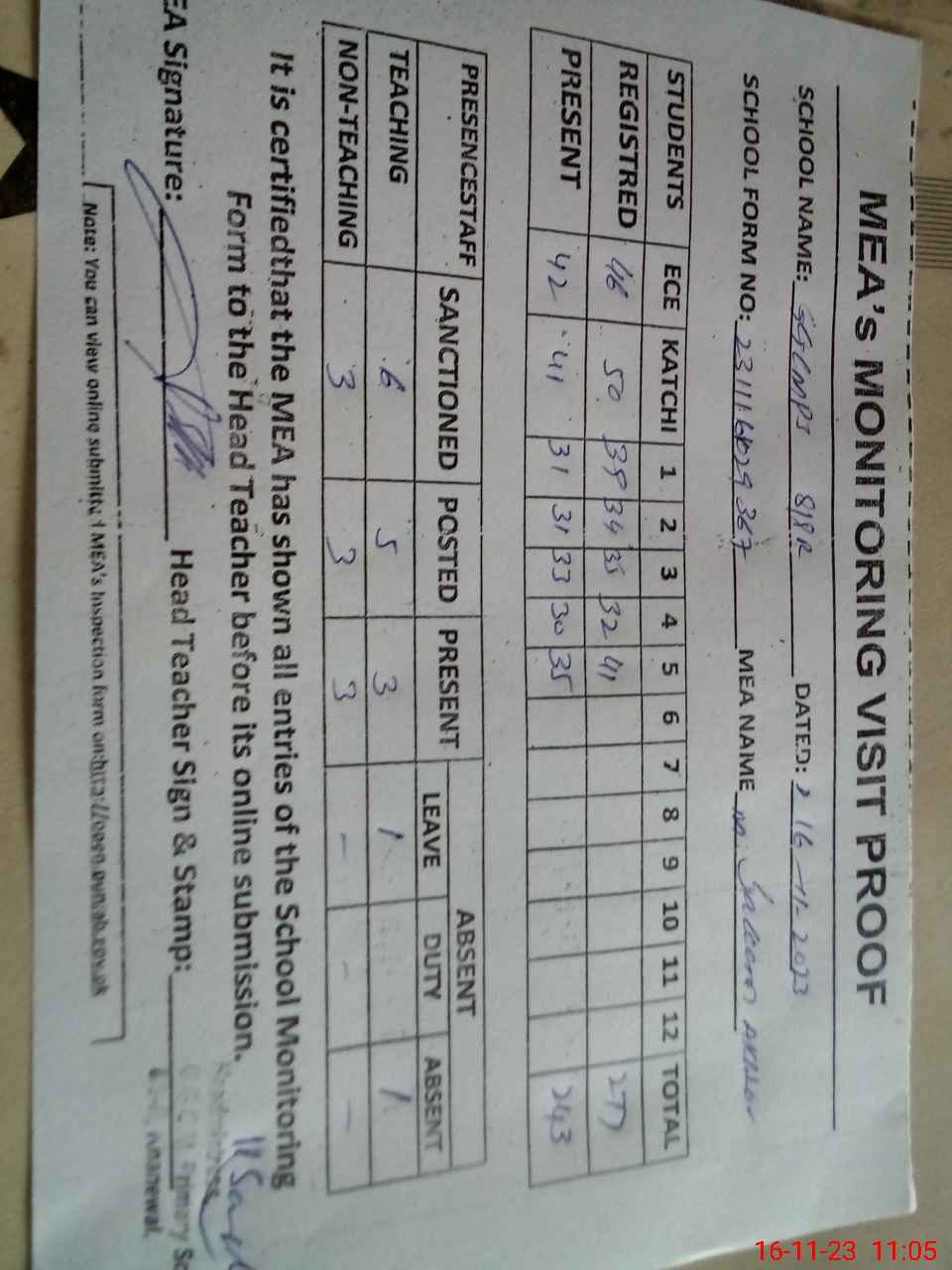 | Attendance Register | Head Teacher | MEA with School | Visit Proof |