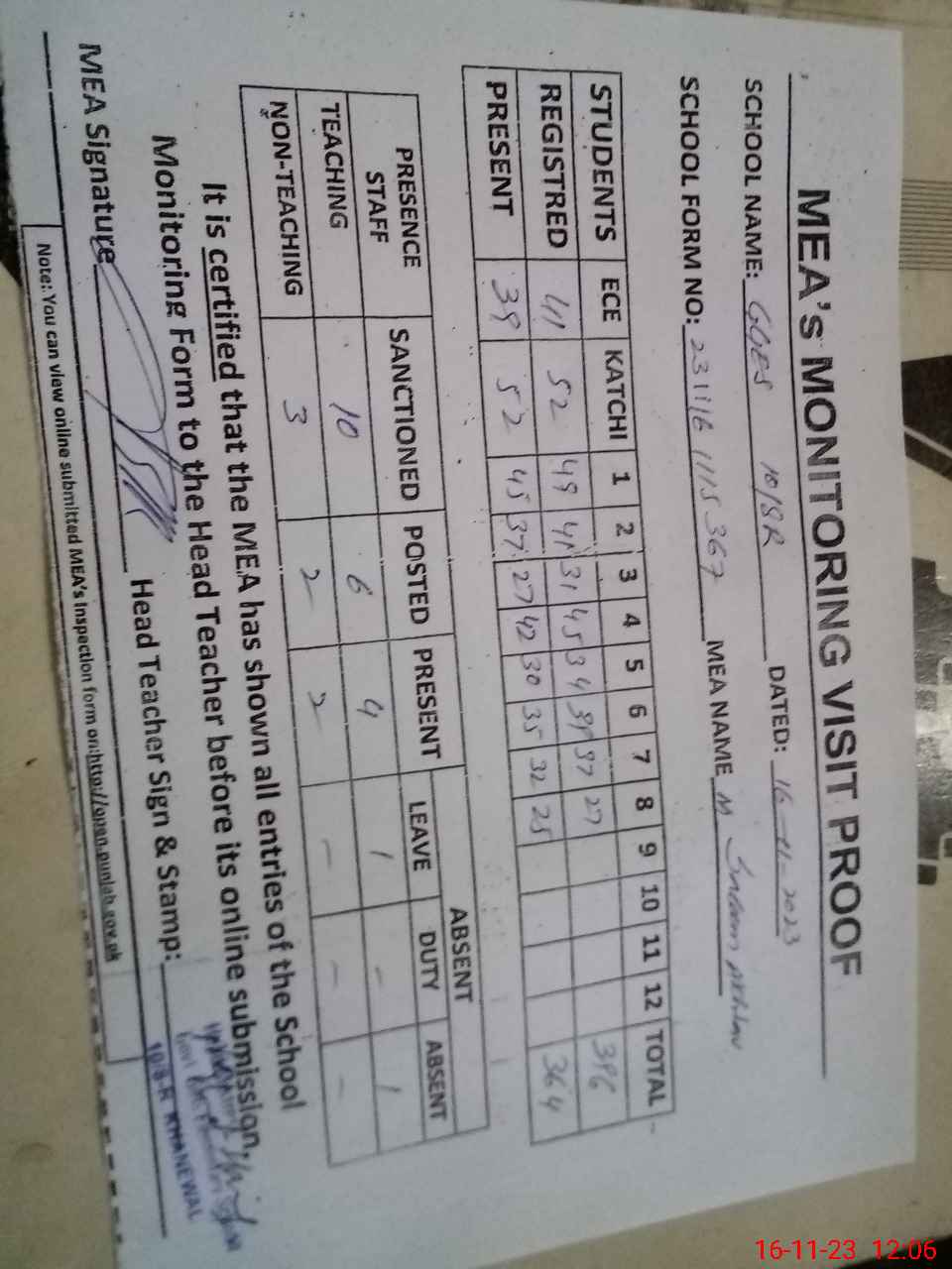 | Certified that this School was Inspected by the Undersigned MEA/DMO Today and the Information Stated Above is as Per Record. | |||||